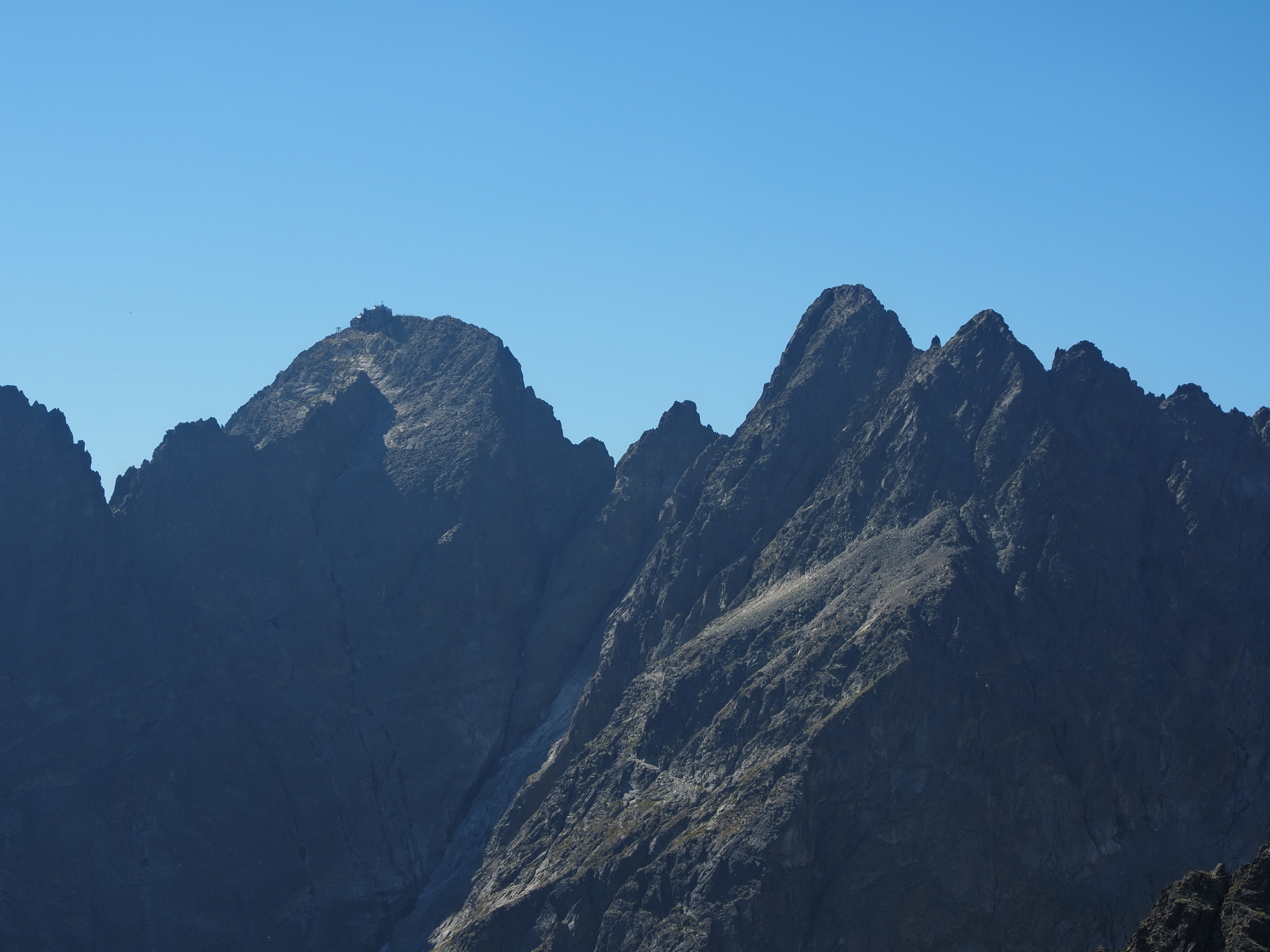 Idąc za nimi lekko pobłądziłem tj. zamiast pójść na przełęcz między Kieżmarskim a Małym Kieżmarskim szczytem wszedłem od razu na Mały Kieżmarski. I to widok z niego. Po lewej Kieżmarski, na środku Łomnica a po prawej Durny Szczyt.