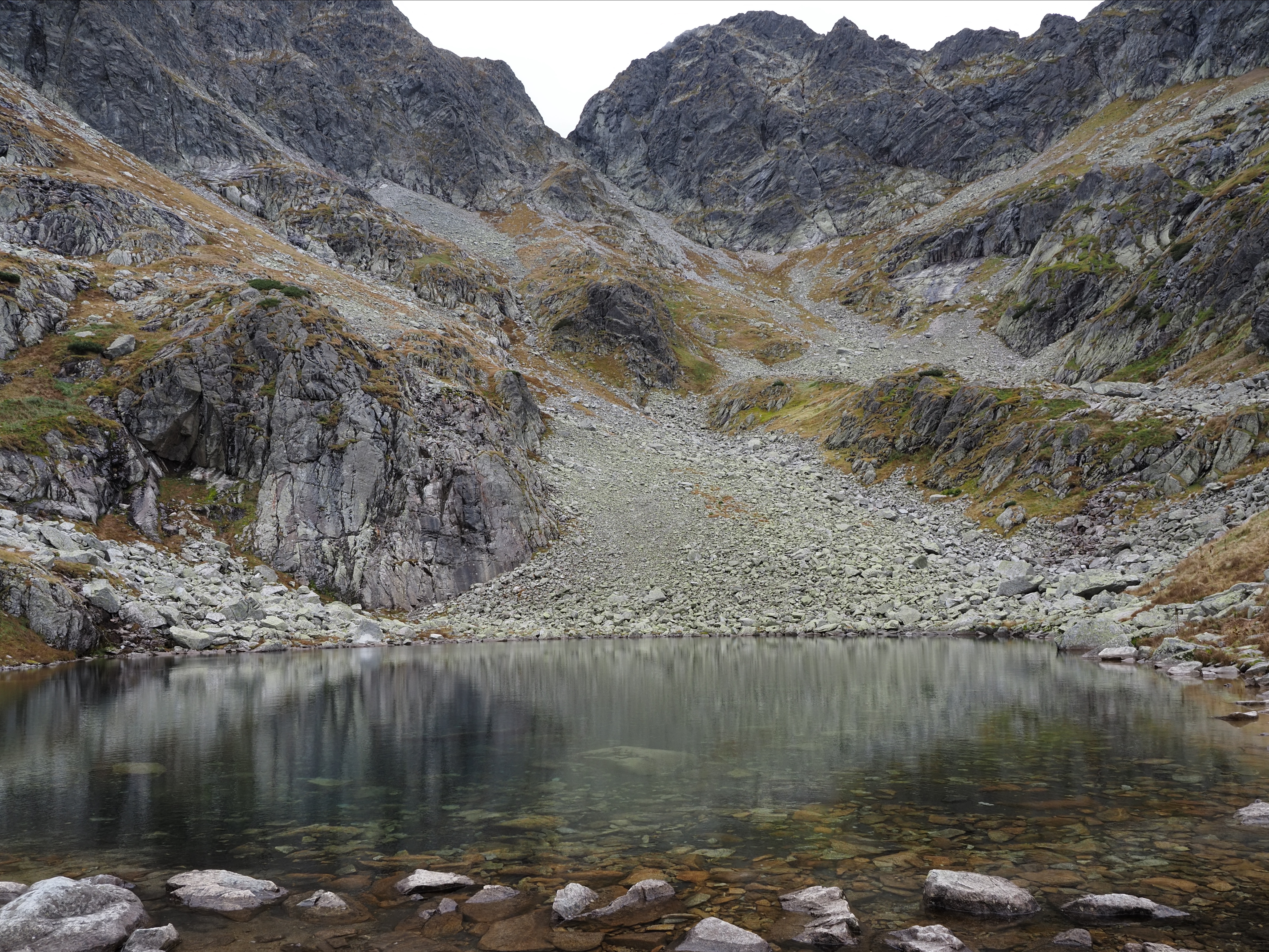 No i wracając do powrotu to z Huńcowskiej Przełęczy miałem dwie drogi - albo do Huńcowskiej doliny tak jak przyszedłem z tym, że tam było krucho więc zastanawiałem się czy nie pójść źlebem w dół wprost do Skalnej doliny. Dwójka rodaków spotkana właśnie weszła tym źlebem wiec pomyślałem, że skoro weszli bez sprzętu to da się zejść. No i się dało ale jak dla mnie było cięźko tj. schodziłem bardzo ostrożnie bo źleb okazał się stromy, czasem z ekspozycją i jednym elementem gdzie musiałem się nieźle nakombinować bo potrzebny był właściwie zjazd żeby być spokojnym. Dla mnie to nauczka na przyszłość, że albo idę po przeczytanej wcześnie trasie albo mam parę dodatkowych zabawek w postaci liny i uprzęży.