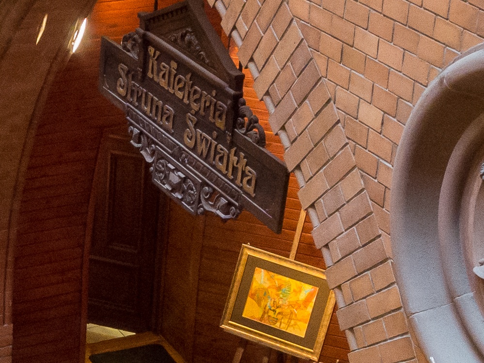 Jeszcze na schodach dostosowałem aparat do swoich przyzwyczajeń – RAW+jpg, Auto ISO 100-800, priorytet przysłony. Wszystkie zdjęcia wywołane w LR4.3 RC1, lekko obrobione wg własnych preferencji. Te z ISO 400 i 640 lekko odszumione. Pierwsze zdjęcia zrobiłem przez okno-widok na kafeterię mieszczącą się na dawnym dziedzińcu Dworu Artusa.