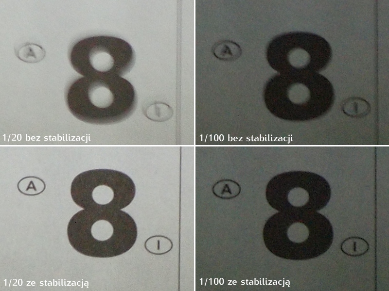 Test to dużo powiedziane, ale zrobiłem małą próbę w warunkach domowych. Obiektyw jak w tytule, ogniskowa 200 mm, po trzy zdjęcia dla każdej kombinacji czas / stabilizacja. Odległość ok. 4 m. Na załączonym obrazku wycinki 1:1 z najlepszych wyników. Łatwo porównać.