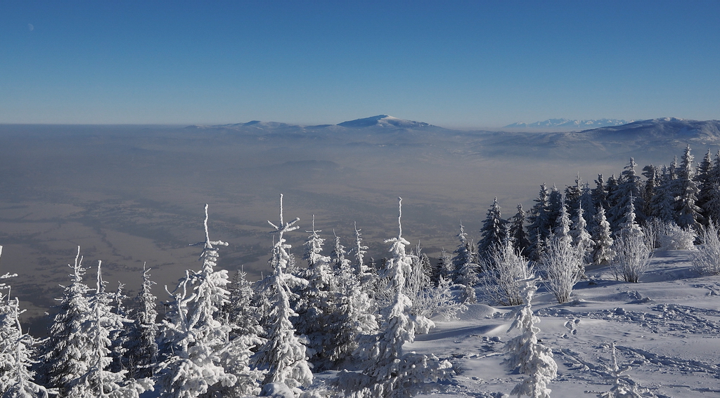 Skrzyczne: widok na Babią Górę po lewej, Pilsko po prawej, pomiędzy tymi szczytami Tatry. Piękny, słoneczny i mroźny dzień, rano było -27 stopni.
