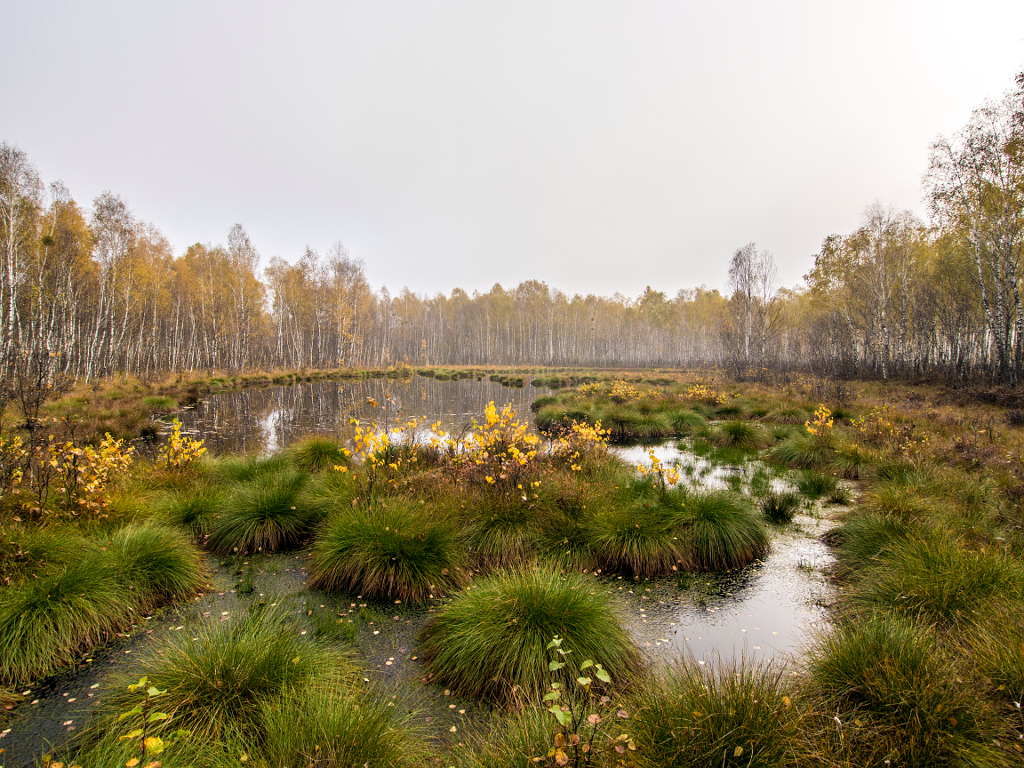Dzięki moosowi miałem dziś mglistym rankiem okazję pochodzić po bagiennej brzezinie z oczkiem wodnym pośrodku.