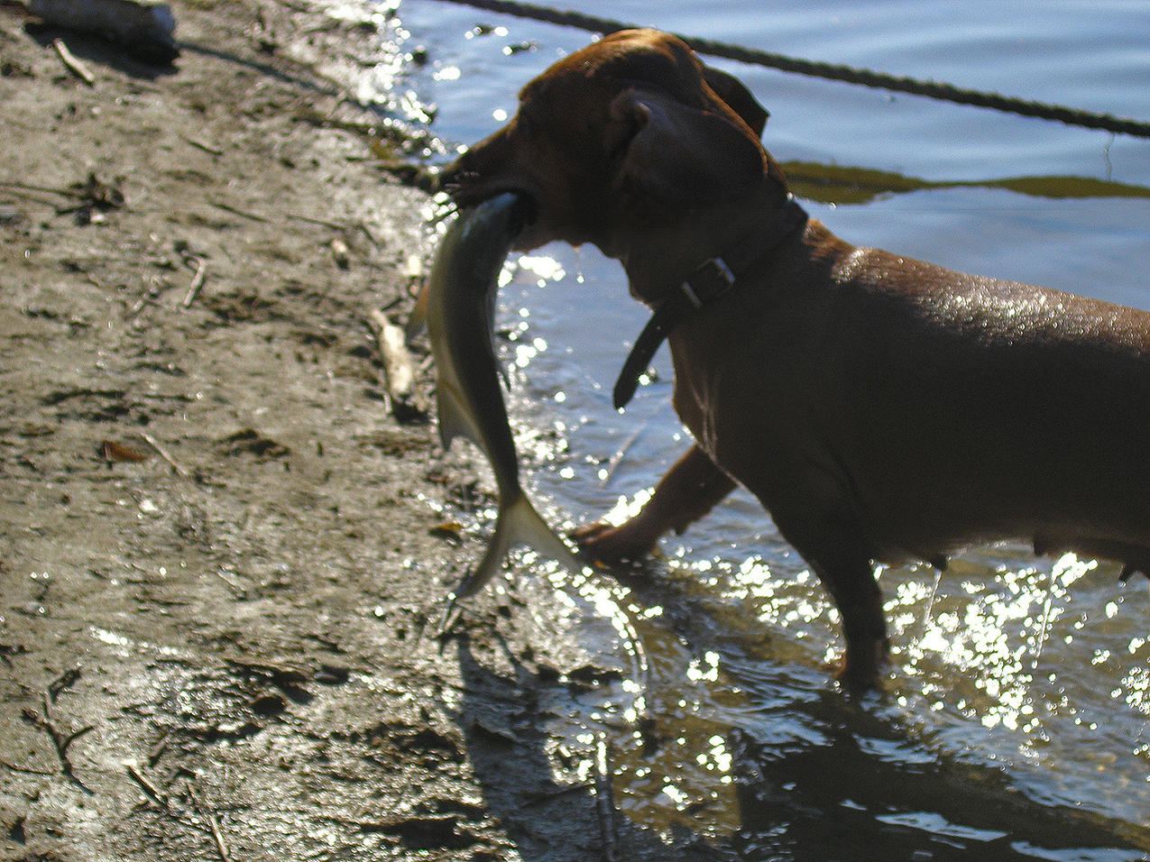 I spokojnie, jako tym razem pies wędkarski przynosi zdobycz panu!