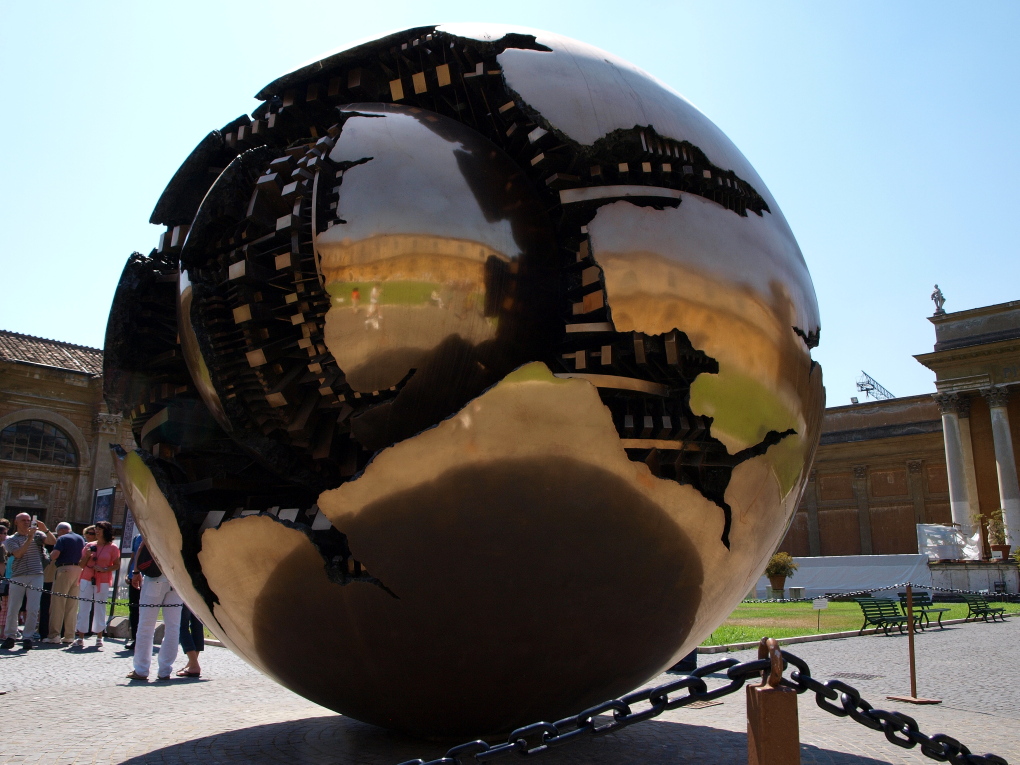 To dwie złote kule autorstwa chyba Arnaldo Pomodoro z muzeum watykańskiego. Na zdjęciu tego być może nie widać, ale wewnętrzna symbolizuje Kościół jako jednostkę centralną świata (nienaruszoną), zewnętrzna to ziemia.
