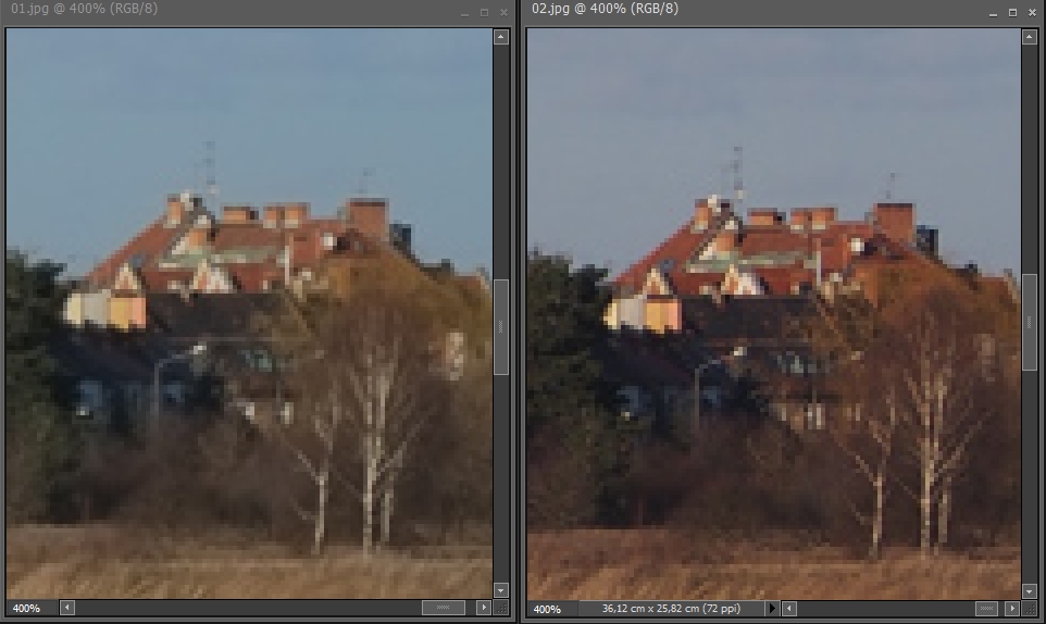 Na podstawie ostatniego przykładu nie oceniałbym ostrości, bo zdjęcia były robione przez dwie różne osoby, które ustawiły ostrość na inne punkty. Na górnym zdjęciu bardziej ostry jest dalszy plan, a na dolnym pierwszy plan. Wcześniejsze przykłady bardziej się nadają do porównania ostrości - zdjęcia robiłem sam, ze statywu, na przymkniętych obiektywach. Olek solidnie wyostrza jepgi, co na pierwszy rzut oka daje wrażenie lepszej ostrości, ale wiadomo, jakie są tego efekty uboczne.