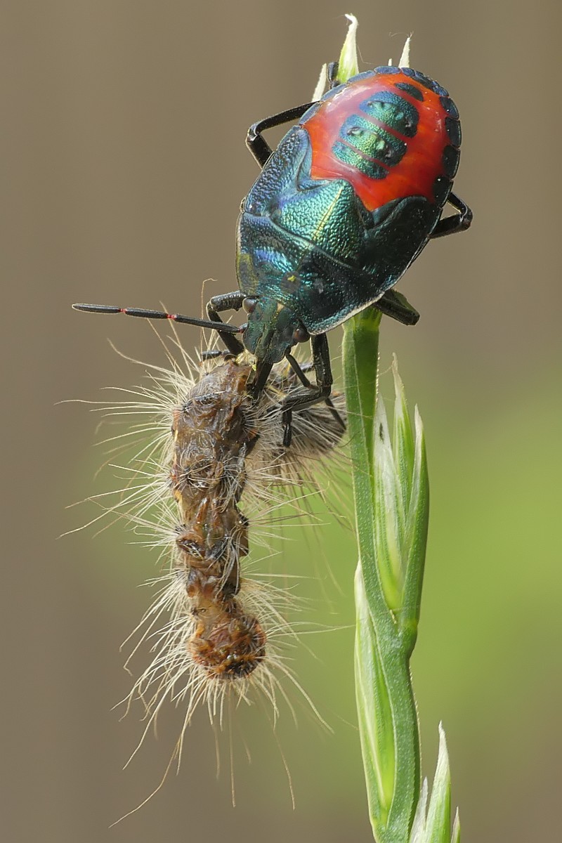 Drapieżna larwa pluskwiaka posilająca się schwytaną gąsienicą: