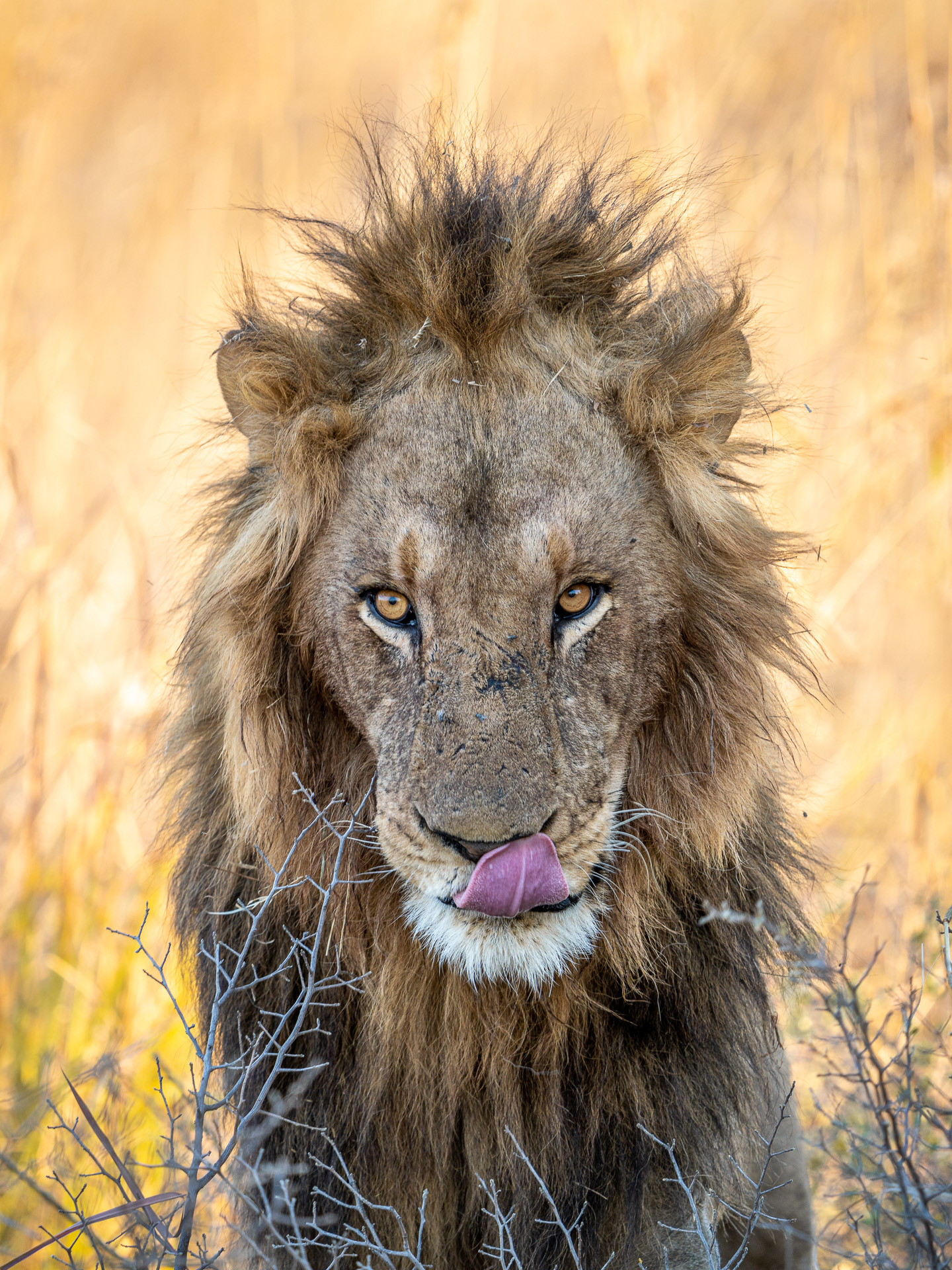 309. Lwy jak wszystkie koty mają bardzo szorstki język. Taki język to duże ułatwienie podczas posiłku, bo lew może nim nawet zedrzeć skórę z ofiary lub wylizać kości z resztek mięsa. Ułatwia też zachowanie czystości, bo szorstkim językiem łatwej pozbyć się brudu i pasożytów z sierści. Na zdjęciu jeden z pięciu samców tworzących koalicję na terenie koncesji Kwara w Botswanie.