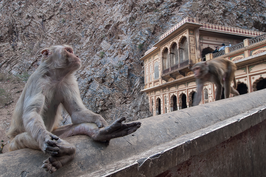 Galta (Świątynia małp) krótki spacer w asyście rezusów :grin: Wielopoziomowe baseny wypełnione wodą z świętego źródła służą pielgrzymom do kąpieli. Na szczycie mała Świątynia Słońca Surya skąd rozpościera się widok na Jaipur. Po zachodzie wracając do miasta udało mi się uwiecznić małpie figle :grin: