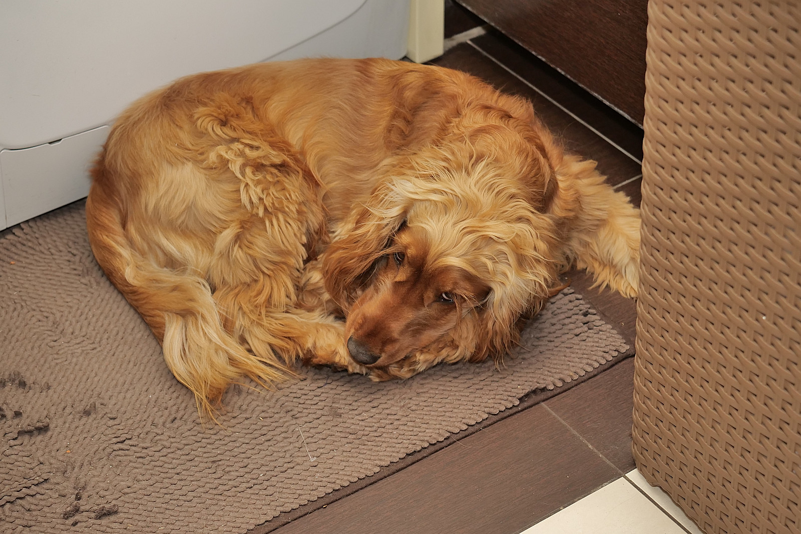 Jagna w łazience kopie dołek w kafelkach. Jak już sobie wykopie, to się w nim ukręci z głośnym ufffff.