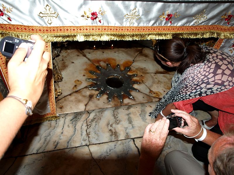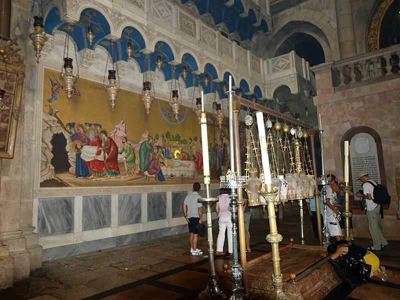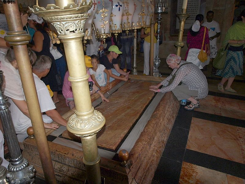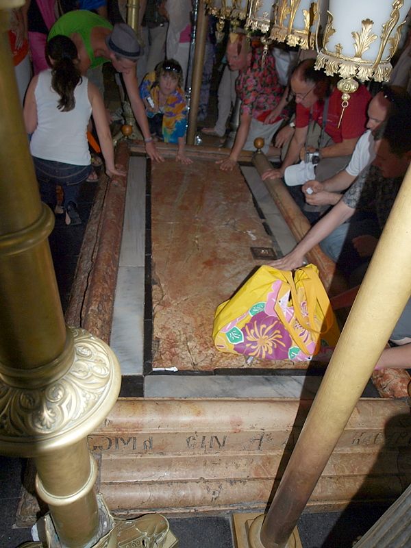 Po wejściu do Bazyliki widzimy tzw Kamień Namaszczenia. To na nim miał leżeć Jezus przed złożeniem jego ciała do grobu. I to na tym kamieniu namaszczano jego ciało i owinięto w całun. Ludzie klękają przy tym Kamieniu. Modlą się, dotykają go czy to rękoma czy ubraniem i całują .