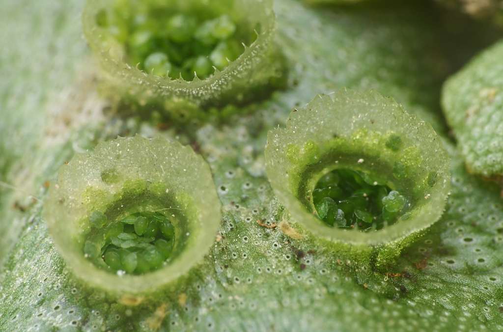 164. Porostnica wielokształtna (Marchantia polymorpha) - wątrobowiec. Na zdjęciu widoczne zbiorniczki z rozmnóżkami (zwane też kupulami) na gametoficie (plecha). Gametofitów nie widziałem - trzeba będzie poobserwować czy coś się zmienia.