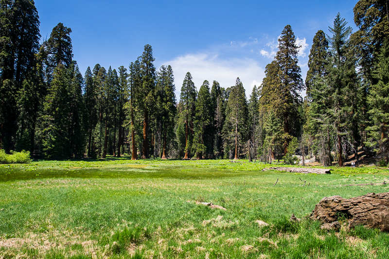 Same okolice Visitor Center, poza samym centrum edukacyjnym, były bardzo fajnie zagospodarowane. W niedalekiej odległości znajdowała się bardzo malownicza trasa Big Trees Trail. Trasa po dużej elipsie otoczonej sekwojami, która prowadziła wokół zielonego skrawka zieleni po środku. Warunki gruntowe w tym miejscu były zbyt surowe dla wymagających bardzo żyznej gleby drzew. Dzięki temu, wewnątrz ogromnego lasu utworzył się "zielony placek", który dodawał temu miejscu jakiejś baśniowej otoczki. Wszystko wyglądało jakoś nienaturalnie i przy okazji bardzo ciekawie.