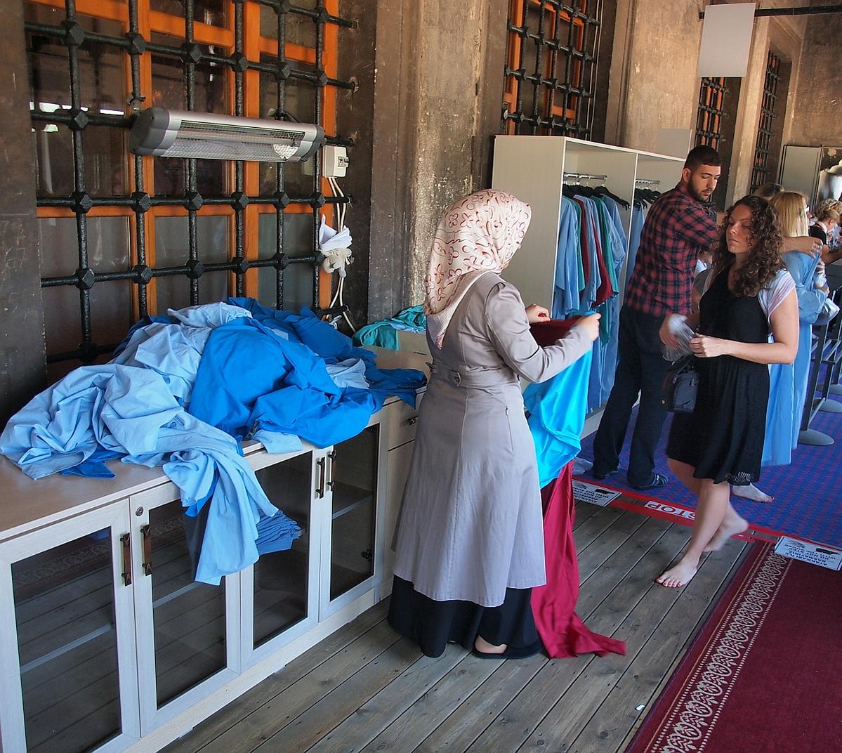 445. Do meczetu nie można wejść nieodpowiednio ubranym. Dbają o to strażnicy, w razie potrzeby strój można po prostu wypożyczyć... Ponieważ do meczetu wchodzi się bez obuwia turyści noszą je wewnątrz meczetu w reklamówkach.