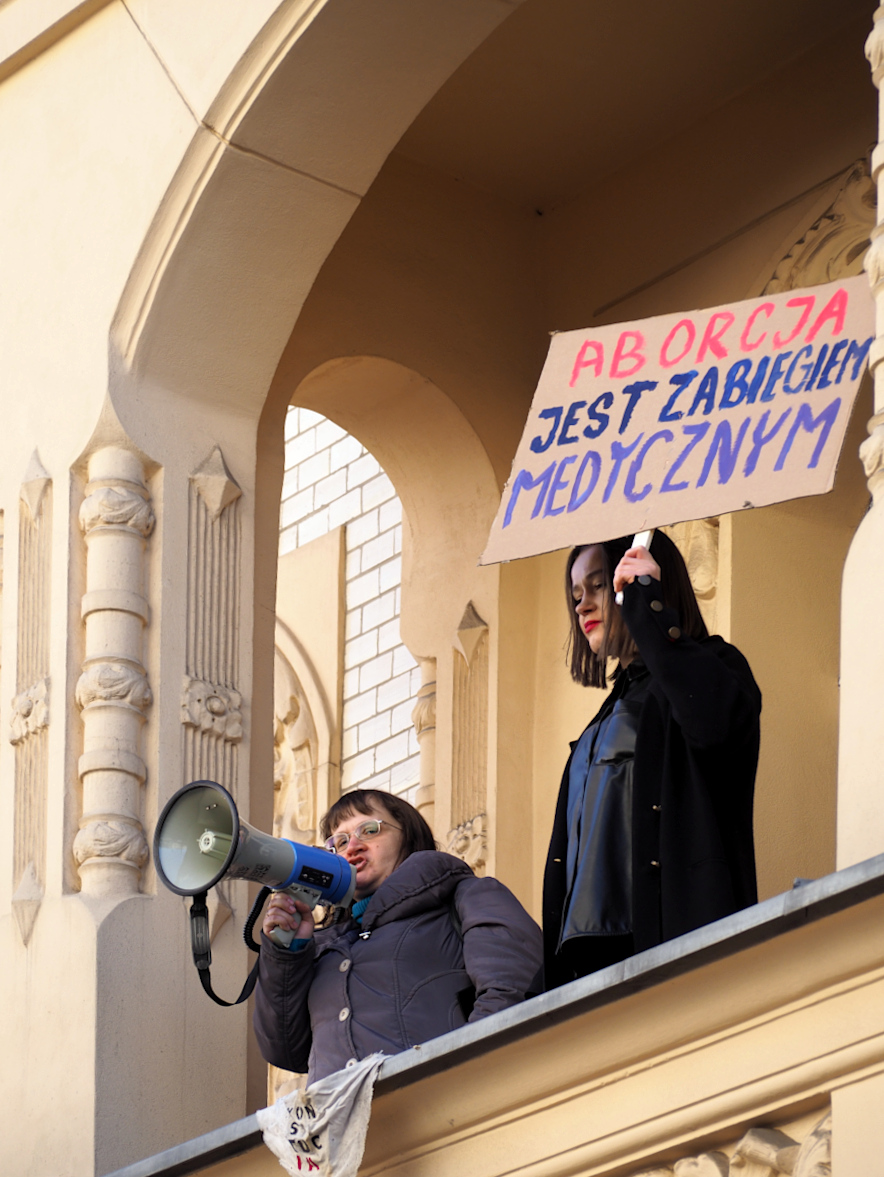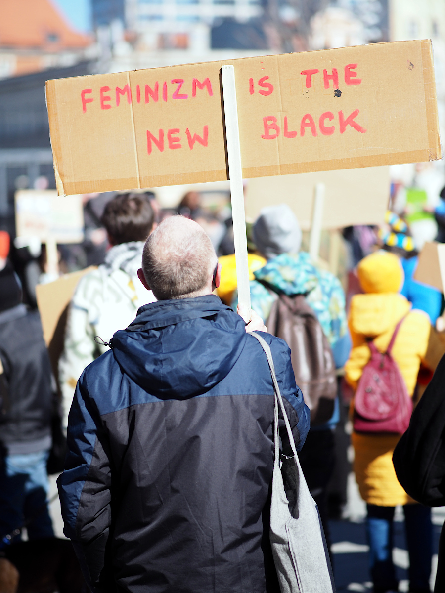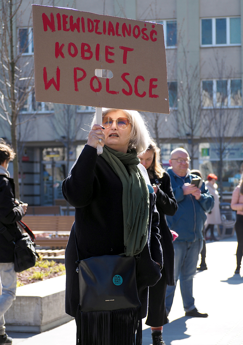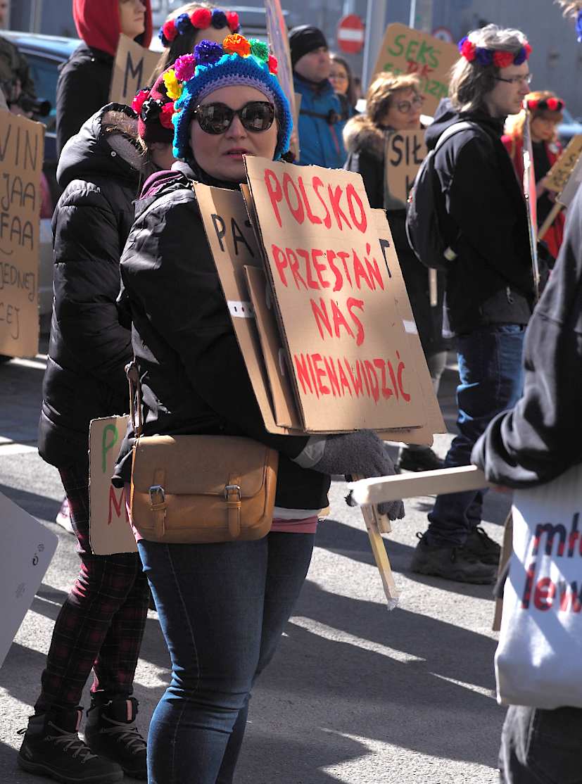 Fajny jest portret idącej w górę schodów pani z tabliczką "Seks tak, seksizm nie". Mimo poręczy w tle.