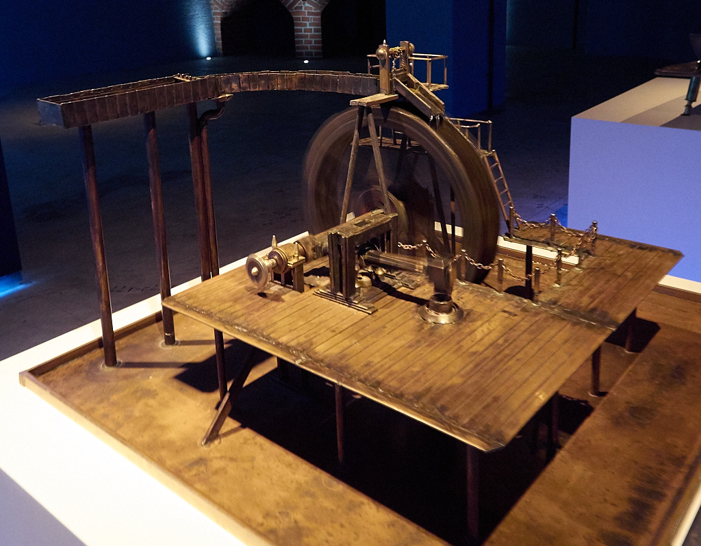 Osobno należy wspomnieć o 'starożytnych' maszynach wykorzystujących wodę. Jedyne w miarę ostre zdjęcie wyszło mi przy młocie wprowadzonym w ruch przez koło wodne (H13). Inne mosiężne eksponaty to: śruba Archimedesa (niedziałający podczas mojej wizyty), zegar wodny, silnik parowy.