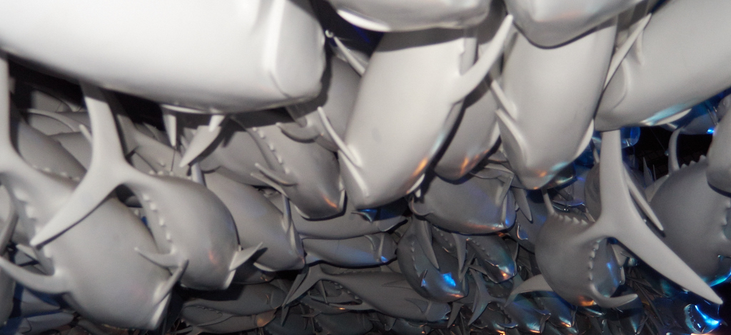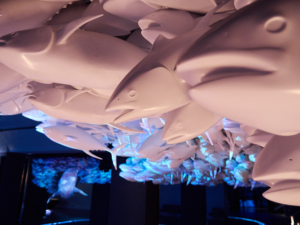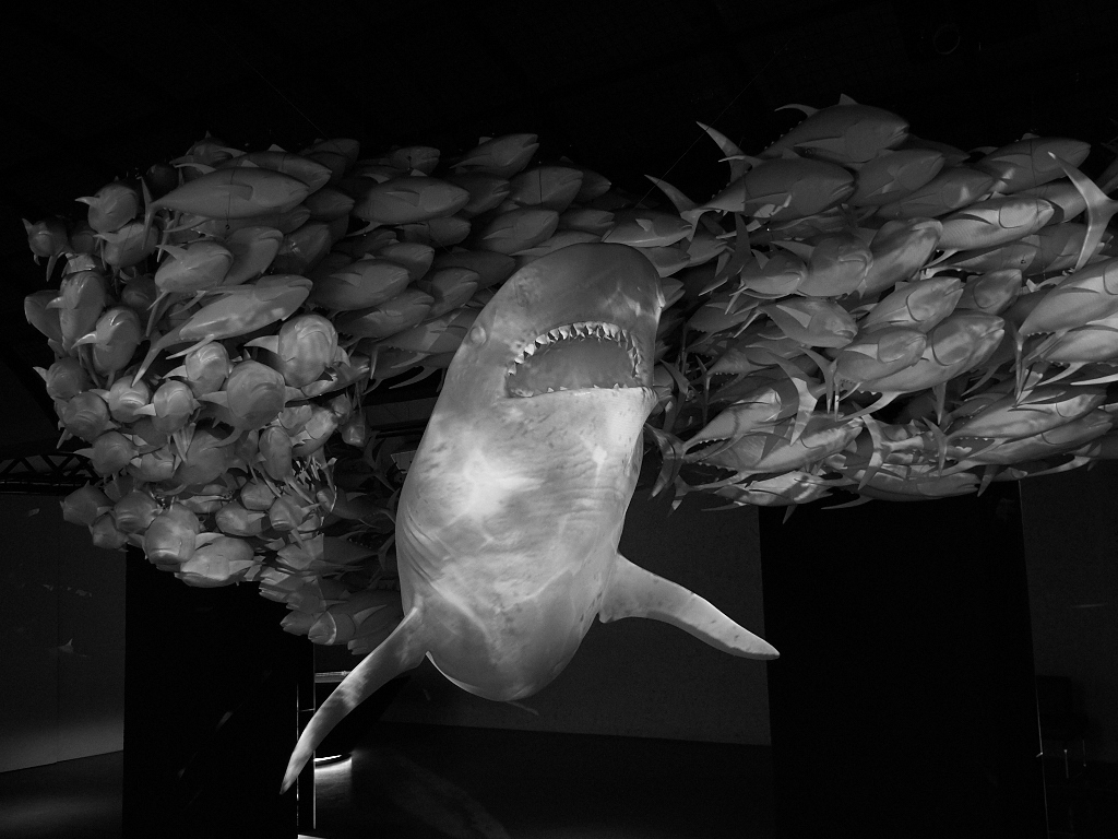 Chyba największe wrażenie robi wisząca pod sufitem ławica ryb (1500 sztuk!), a wśród nich polujący rekin. Kilka zatem ujęć tej ekspozycji w różnych wariacjach.