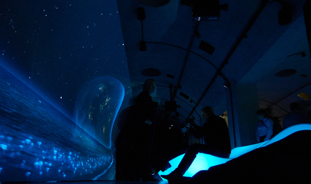 Pierwsze pomieszczenie to sala multimedialna. Na ścianie wyświetlany był film, ale mnie bardziej zainteresował kręcący się glob zawieszony nad taflą wody (H4), na którym widać było przesuwające się chmury(H5 i H6), ale także inne prądy morskie itp.