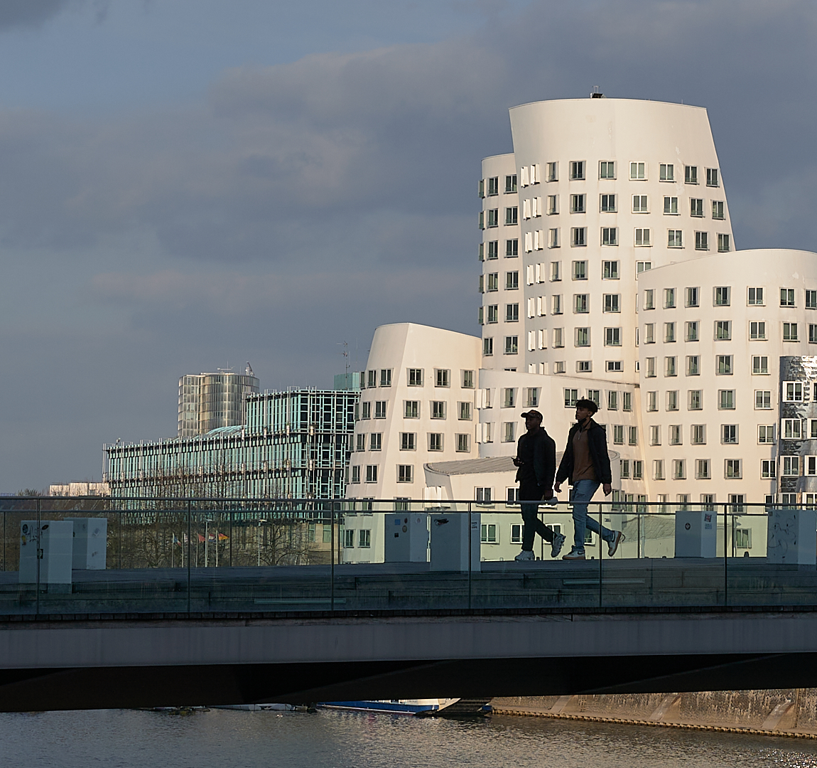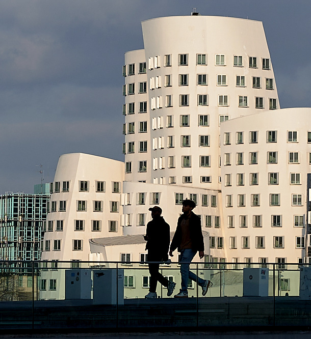 Zobacz jak by to wyglądało gdybyś zwęził kadr pozostawiając tylko jasny budynek i dwie ciemne sylwetki :-)