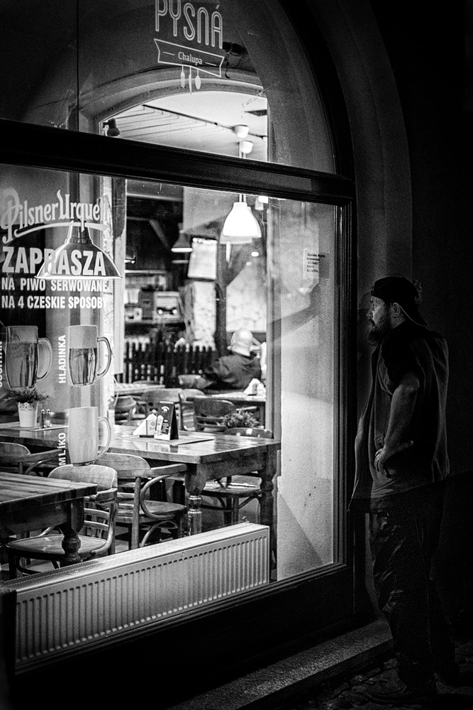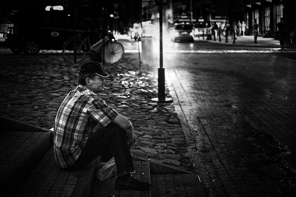 Prześwietna foteczka. Kompozycja współgra z treścią. Zimny połysk bruku, asymetria - gość z prośbą o wsparcie po prawej odstawiany coraz bardziej na bok - w prawo i obojętność towarzystwa z lewej. Znakomita opowieść o trudzie życia.
