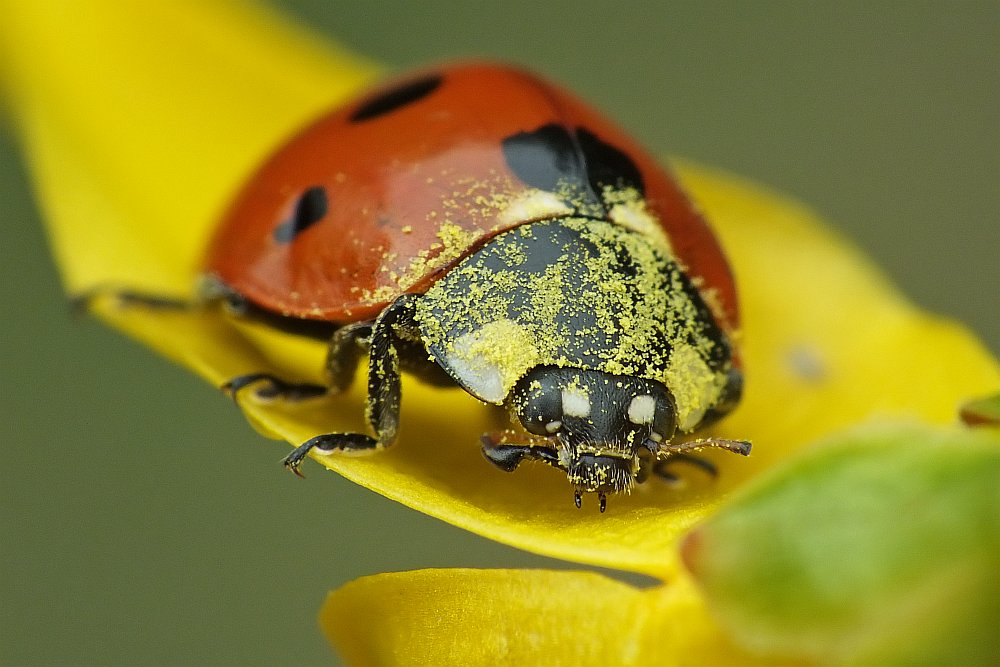 i oblepiona pyłkiem biedronka spacerująca po kwiatach forsycji:
