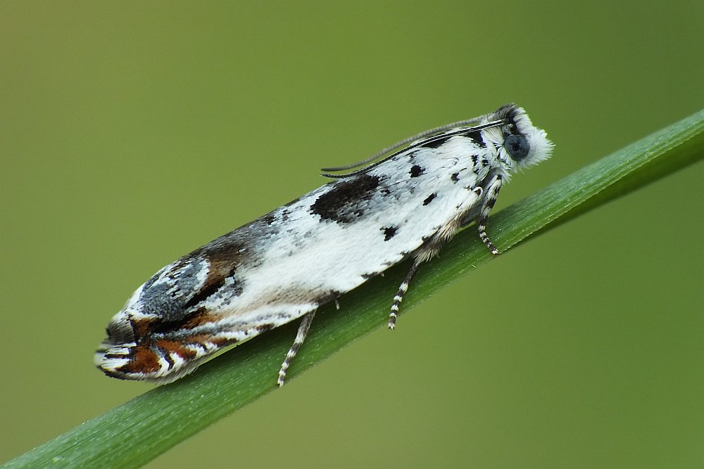 Przedstawiciel grupy motyli mniejszych na liściu trawy: