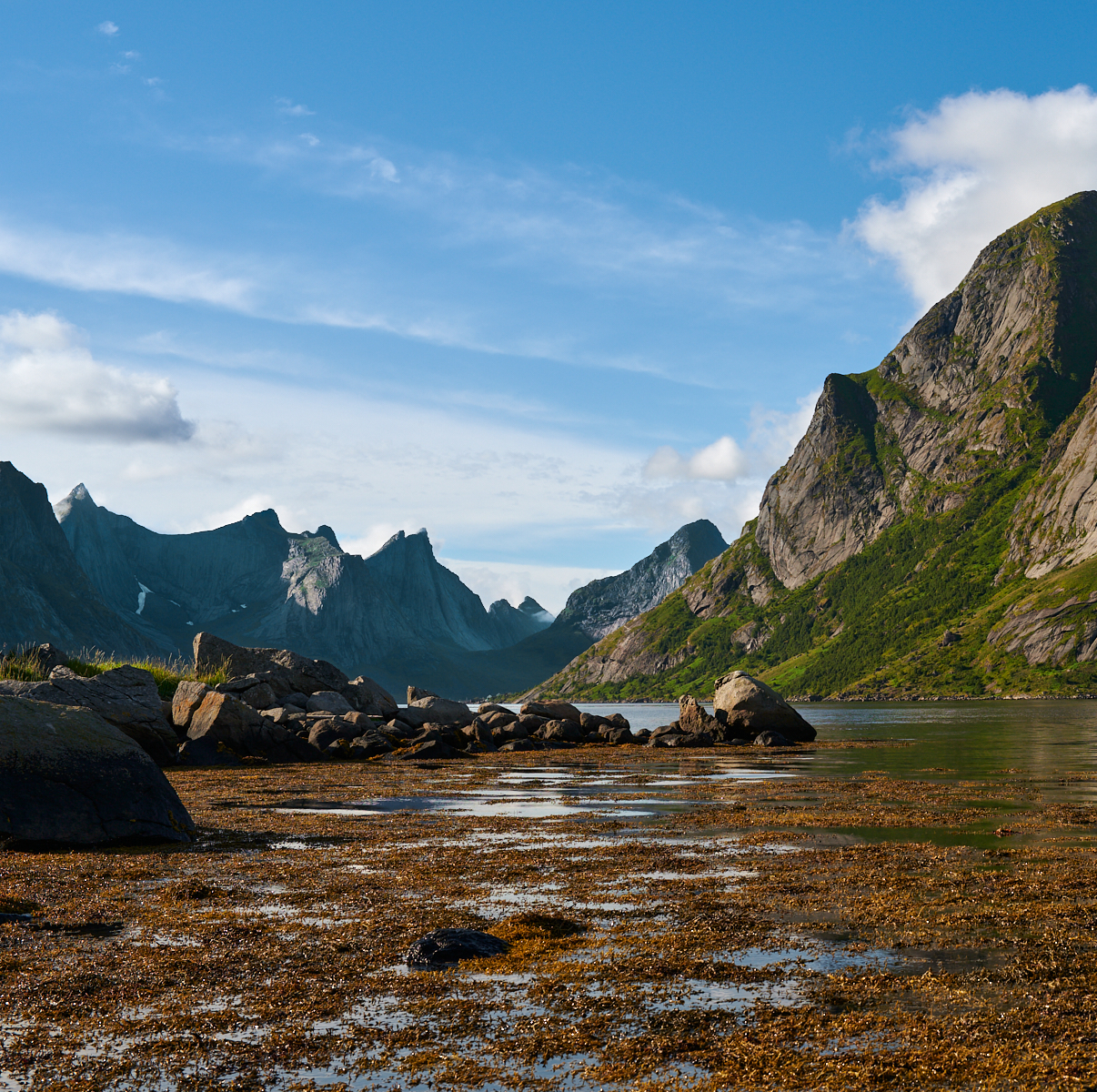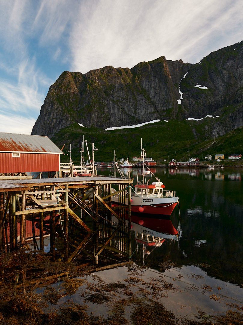 Reine w oddali za wodą, potężne skały obok, smużące odbicia w wodzie i niebo przyjaźnie błękitne z welonkiem chmur. Wyjątkowo malownicze, inspiruje wyobraźnię.