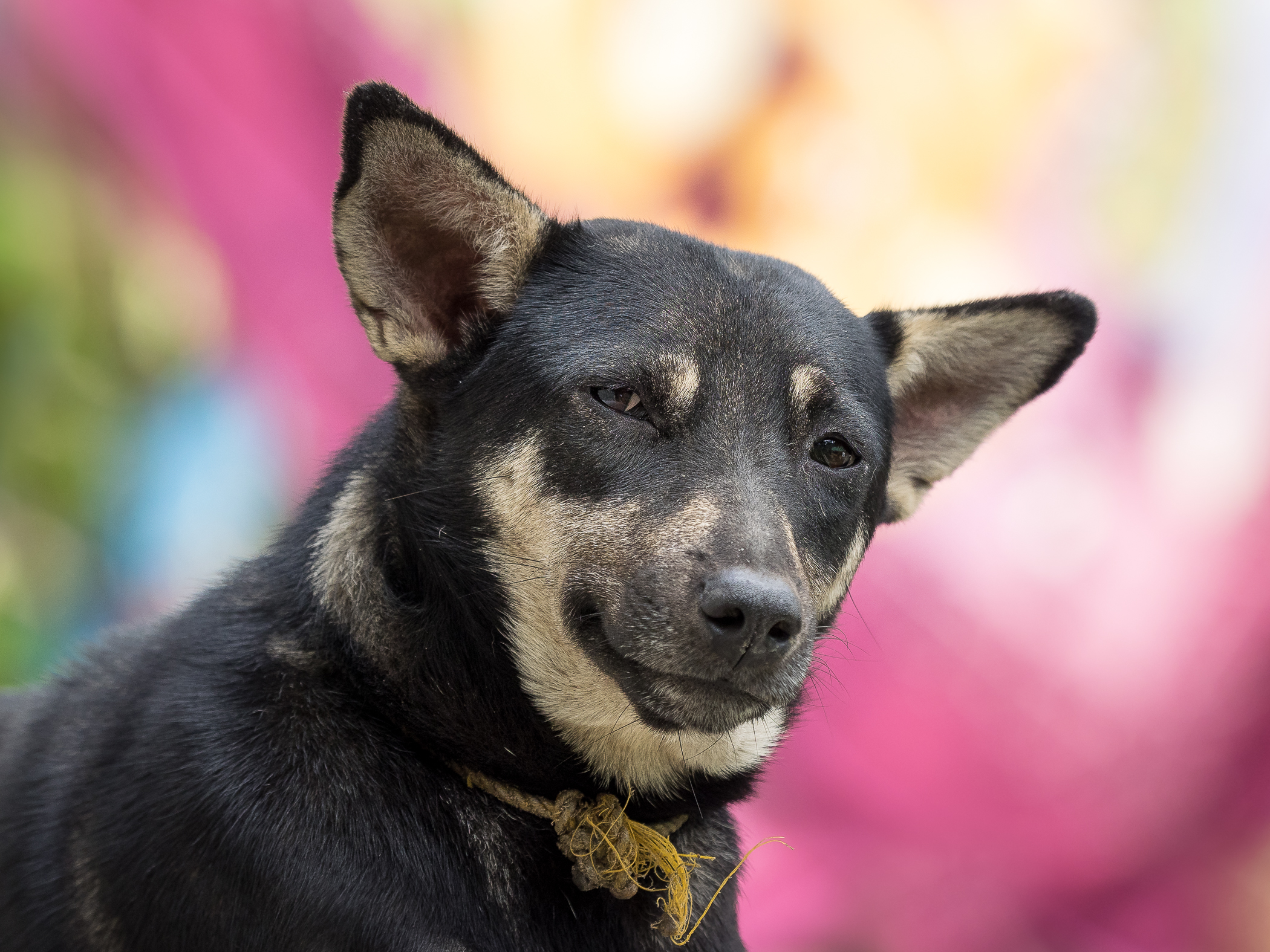 Piesek filipiński z bardzo badawczym i chyba nieco groźnym spojrzeniem. Pętla ze sznurka zamiast obroży świadczy że chyba nie ma zbyt lekkiego życia. Za to wzrok Gucia radosny i ufny. A Jagna jak zwykle rozkoszna.