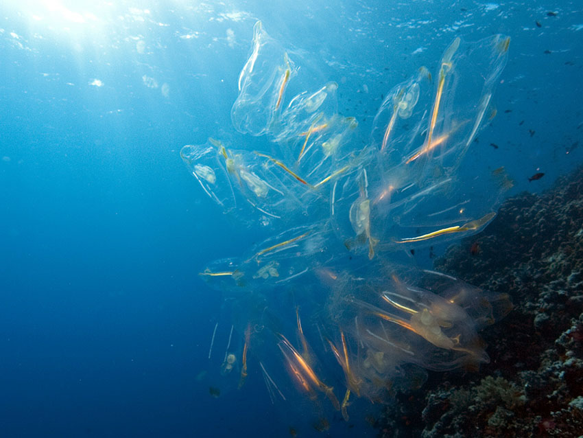 Sprzągle (Thaliacea) to grupa stworzonek, która trzyma się razem unosząc w wodzie i przepuszczając przez siebie wodę wsuwa wszystko to co uda mi się odfiltrować. Podobno dziwnie rozmnażają bo w koloni tylko przez podział a płciowo dopiero kiedy jest ich mniej.