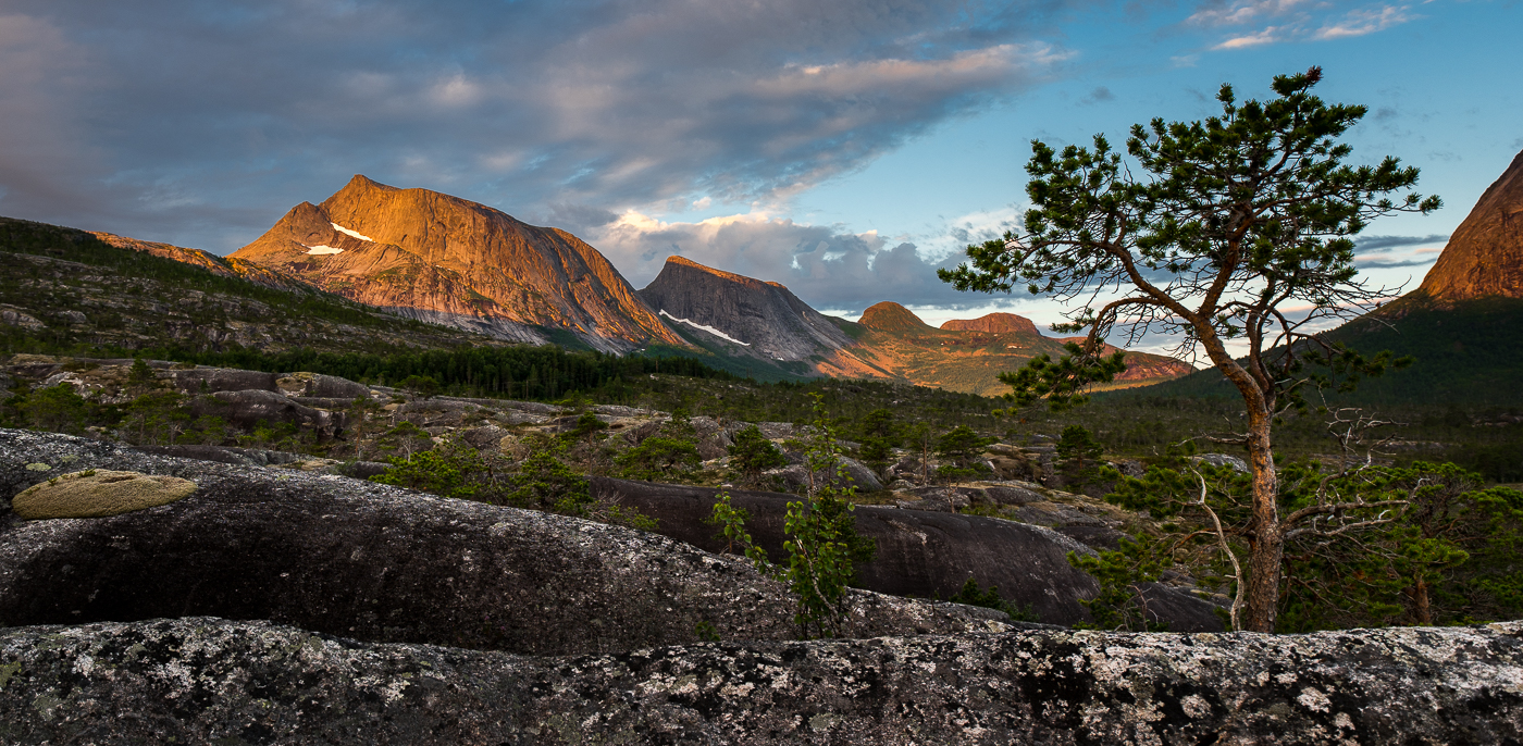 636 też - z inspirującym plastycznie drzewkiem po prawej i górami w tle, z łukiem (siodłem) podpierającym oświetlone cynobrem szczyty i niebo nad nimi.