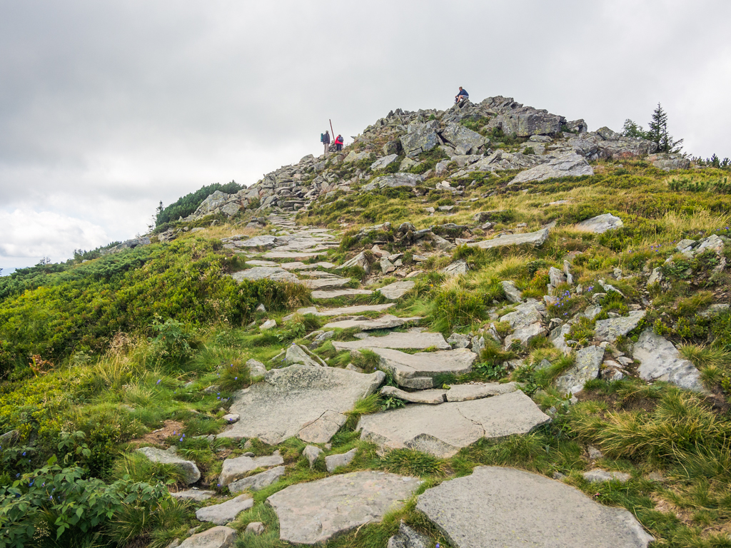 Na górę poszedłem czerwonym szlakiem z Przełęczy Krowiarki. Początkowo idzie się lasem szeroką ścieżką poukładaną z kamieni.