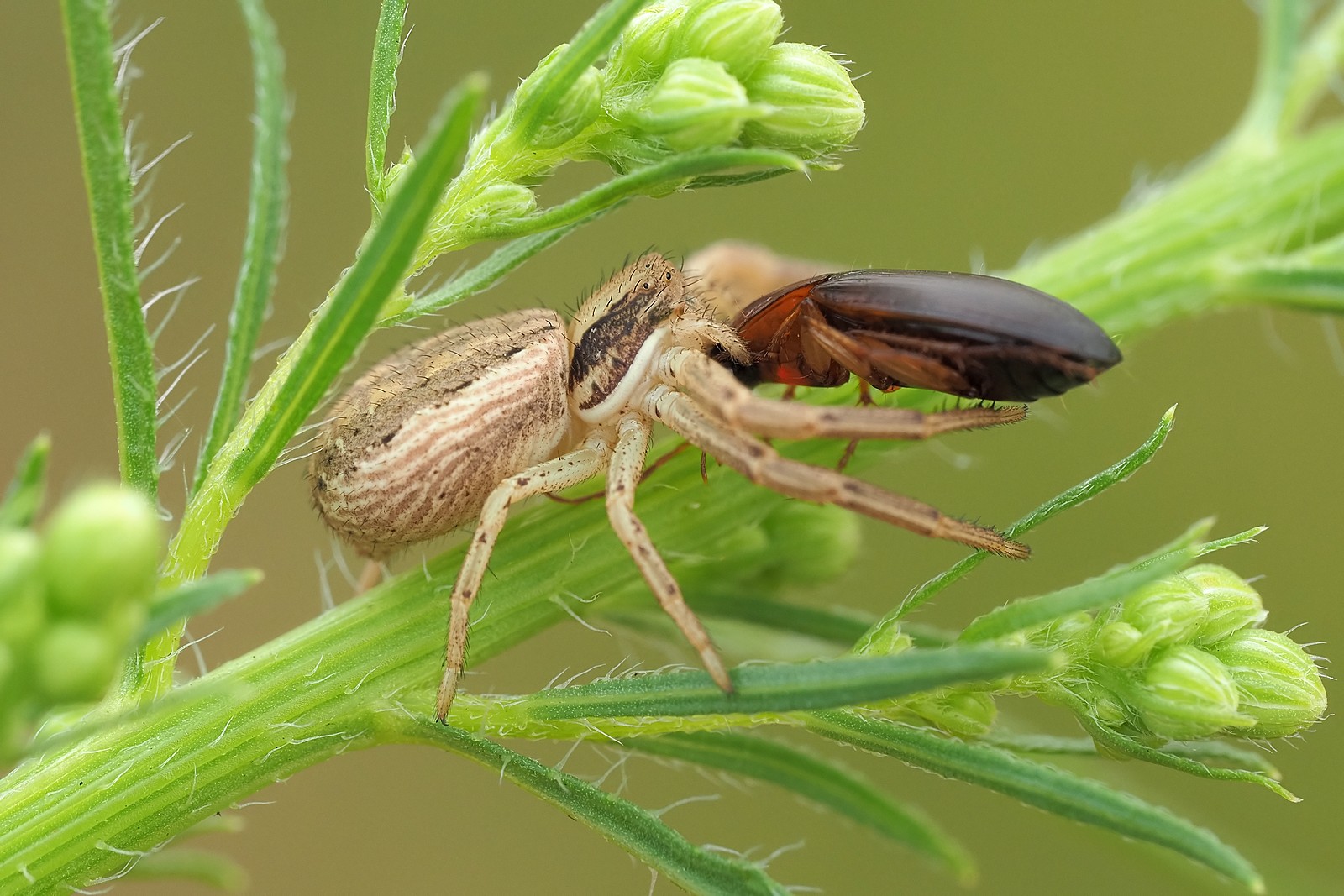 Zażartka mrówkowata zaczajona na kwiatostanie nawłoci kanadyjskiej: