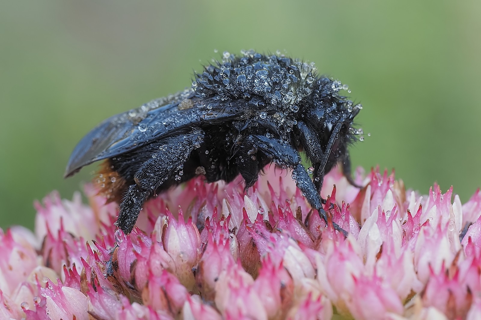 Trzmielec czarny w porannej rosie: