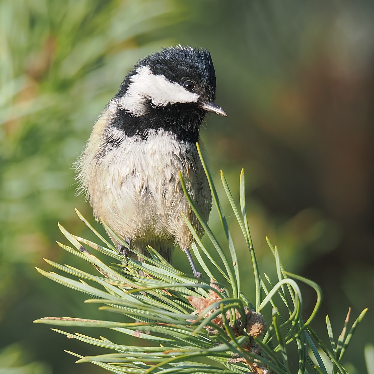 Sosnówka odpoczywająca po kąpieli na czubku gałęzi sosny: