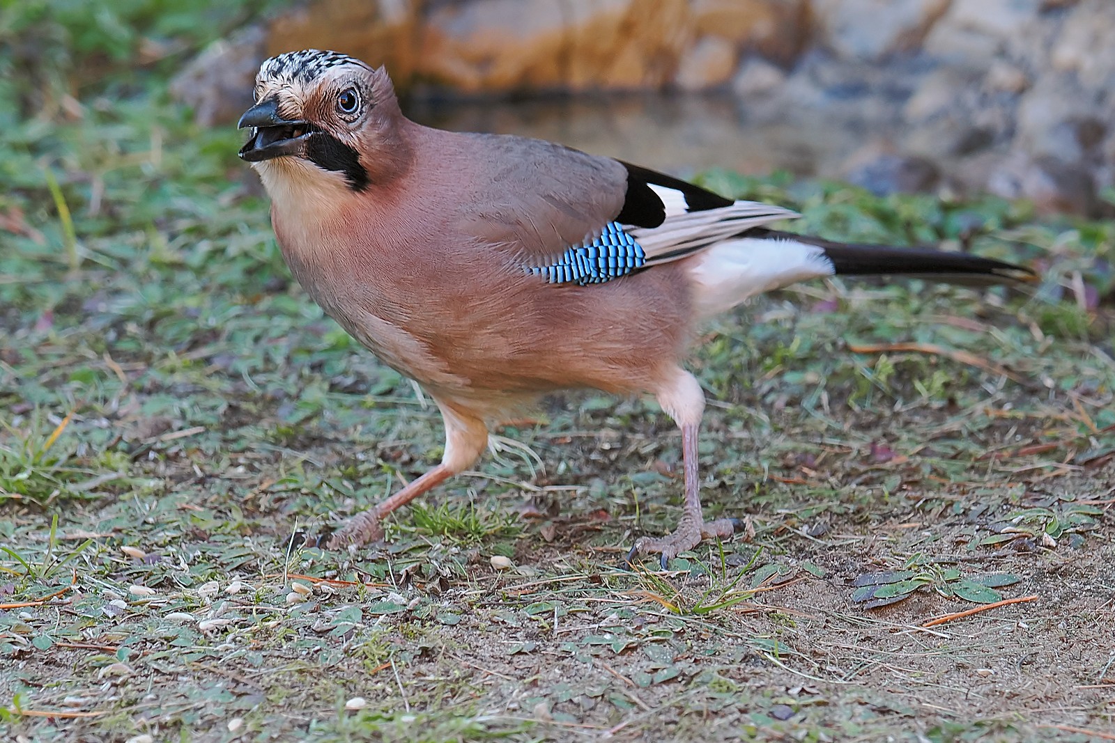 Sójka zbierająca rozrzucone nasiona słonecznika - przed każdym chwyceniem nasiona uważnie się rozglądała czy nic jej nie zagraża: