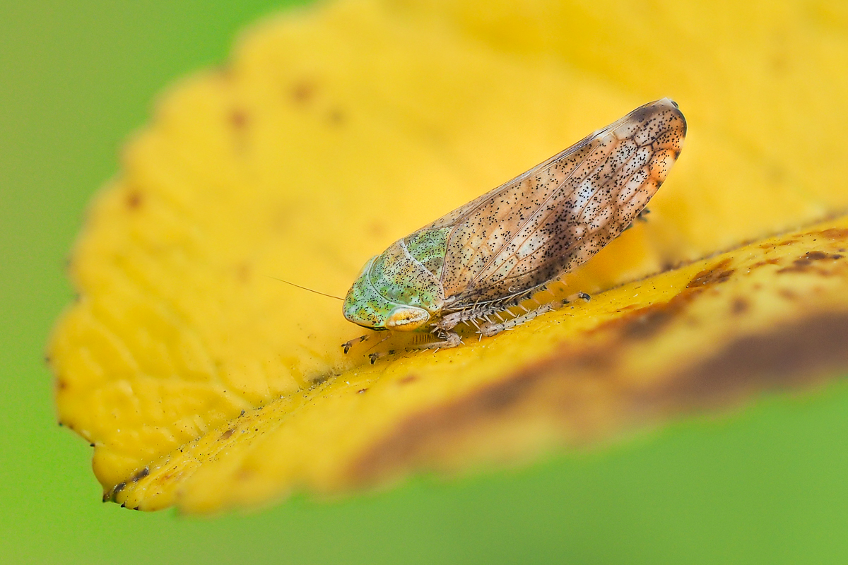 Superfotka. Tło bez wyjątki zielone, żyłki na liściu współgrają z nitkami pajęczyny. Drapieżnik za delikatna zasłoną z plecionki. Strzałka na grzbiecie wskazuje kierunek ataku.