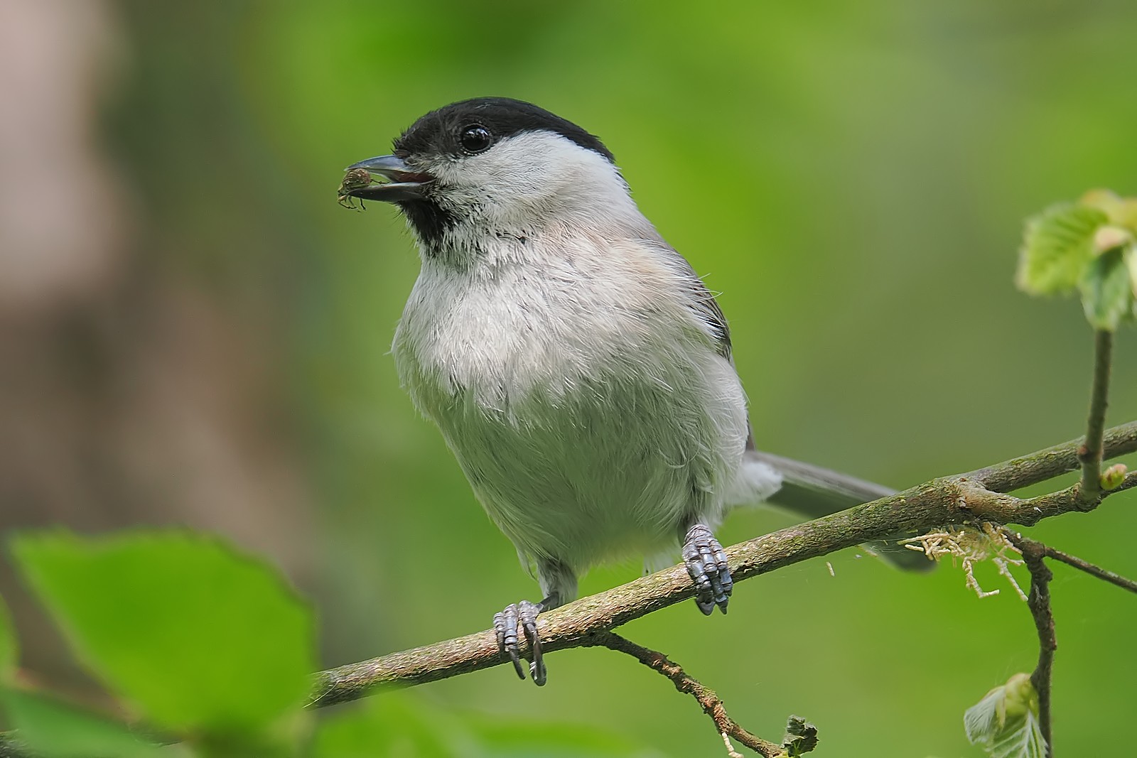 Sikora uboga ze zdobyczą (jakimś małym chrząszczem - prawdopodobnie opuchlakiem) w dziobie: