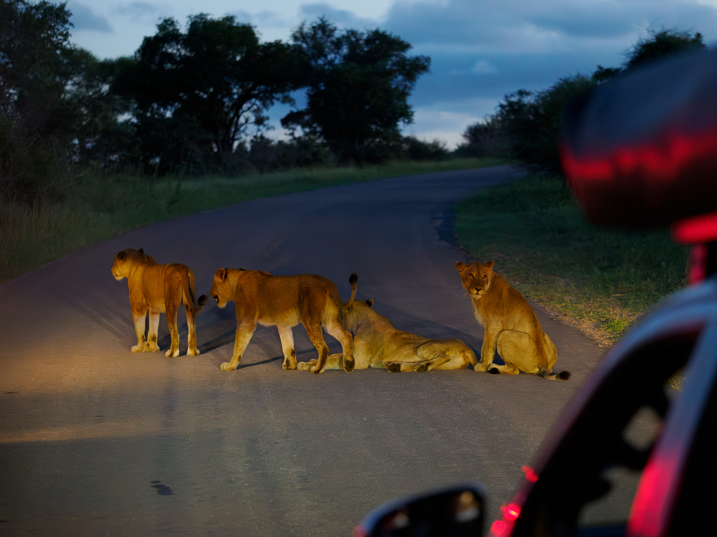 W Parku Narodowym Krugera byliśmy tylko półtora dnia. Postaraliśmy się wykorzystać je na maksa- pierwszego dnia pojechaliśmy też na wieczorne safari ale coś naprawdę ciekawego zdarzyło się dopiero pod sam koniec gdy lwice zablokowały nam drogę.