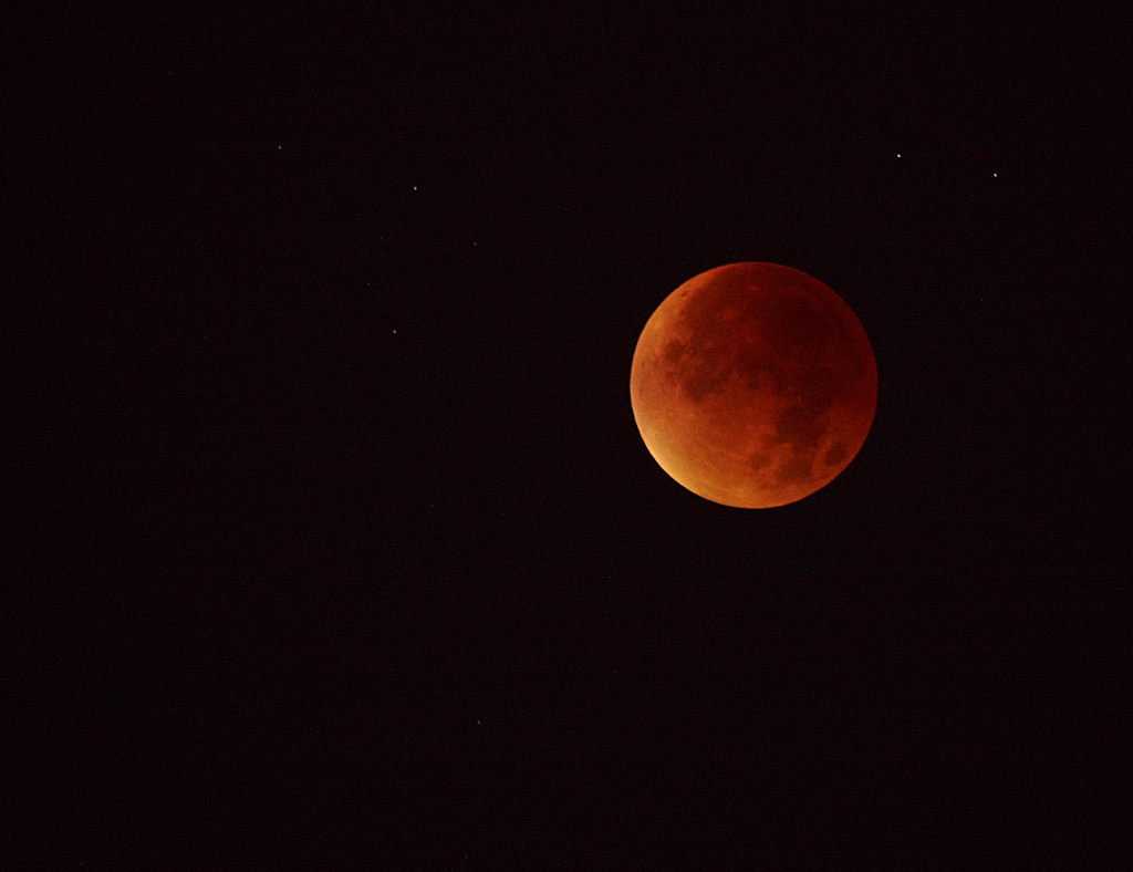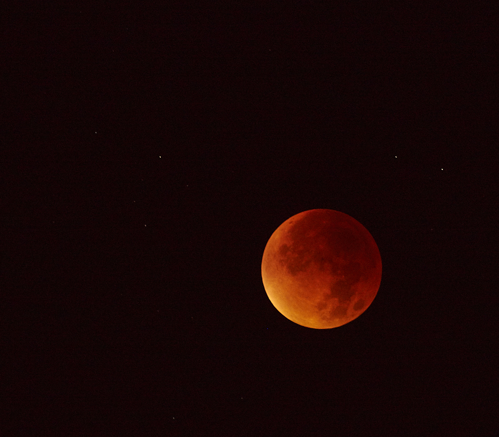 U mnie pogoda była super, całe wydarzenie doskonale widoczne, od samego początku aż do całkowitego zaćmienia kiedy zniknął ostatni fragment księżyca i nagle jak za dotknięciem czarodziejskiej różdżki niebo zasnuły chmury. Tyle z czerwonego księżyca. Coś tam jeszcze próbowałem focić, ale wymarzłem i postanowiłem wracać. Jak jechałem do domu to chmury ustąpiły i zza okien auta mogłem podziwiać czerwony księżyc.