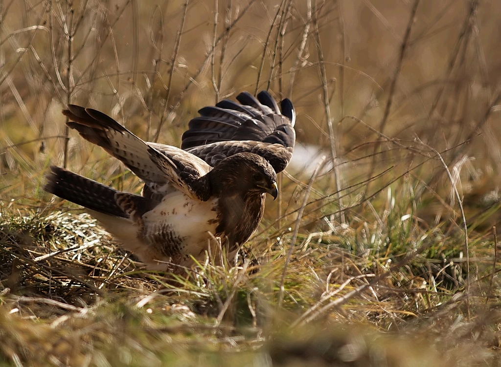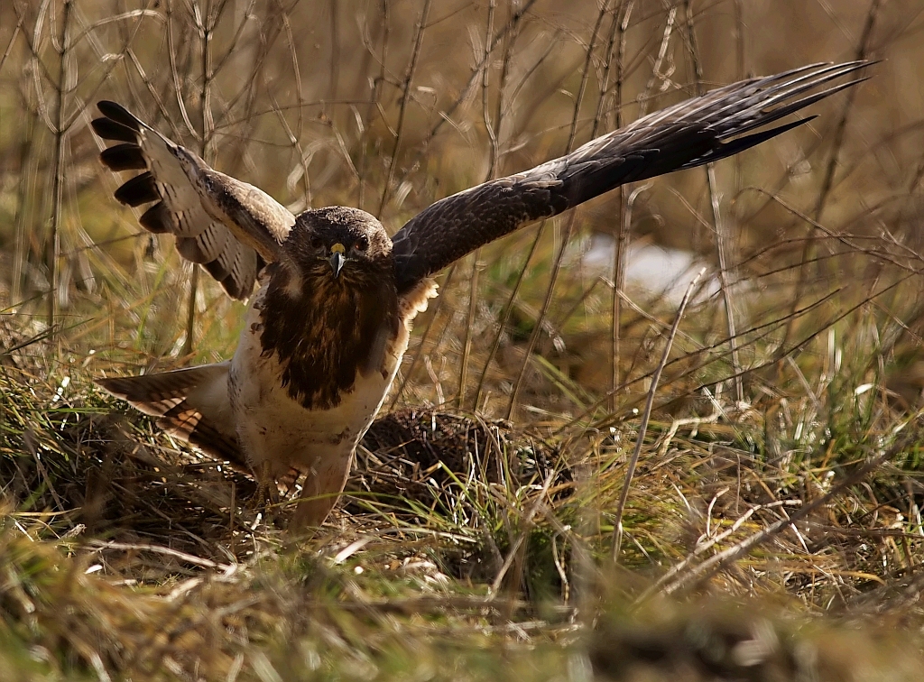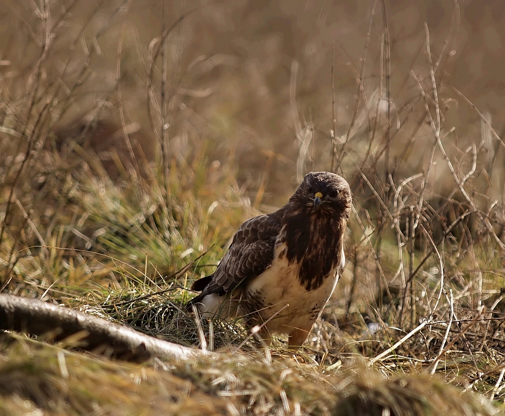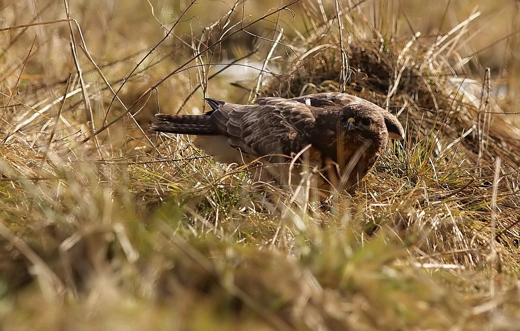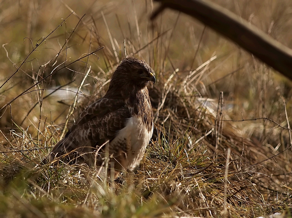 Jednak od końcówki stycznia jakoś się wyludniło, zapewne to o czym pisałem, ktoś tam polował i wypłoszył mi ptaszory, zdewastował też czatę. Odbudowałem i dalej nęciłem, porcje znikały ale już nie tak szybko jak wcześniej, parę razy siadałem bez rezultatów, straciłem już nadzieję. Pod koniec testowania przyfarciło mi się nieco, przyleciał dosłownie na parę minut jeden Myszak. Najperw usiadł na drzewie, nieufnie rozglądał się, po czym wylądował obok nęciska w gęstym zielu, tam jeszcze chwile pobaraszkował i niedługo potem czmychnął w siną dal i tyle go widziałem. Jako, że już wcześniej był w teście opisany to wstawiam tylko kilka zdjęć.