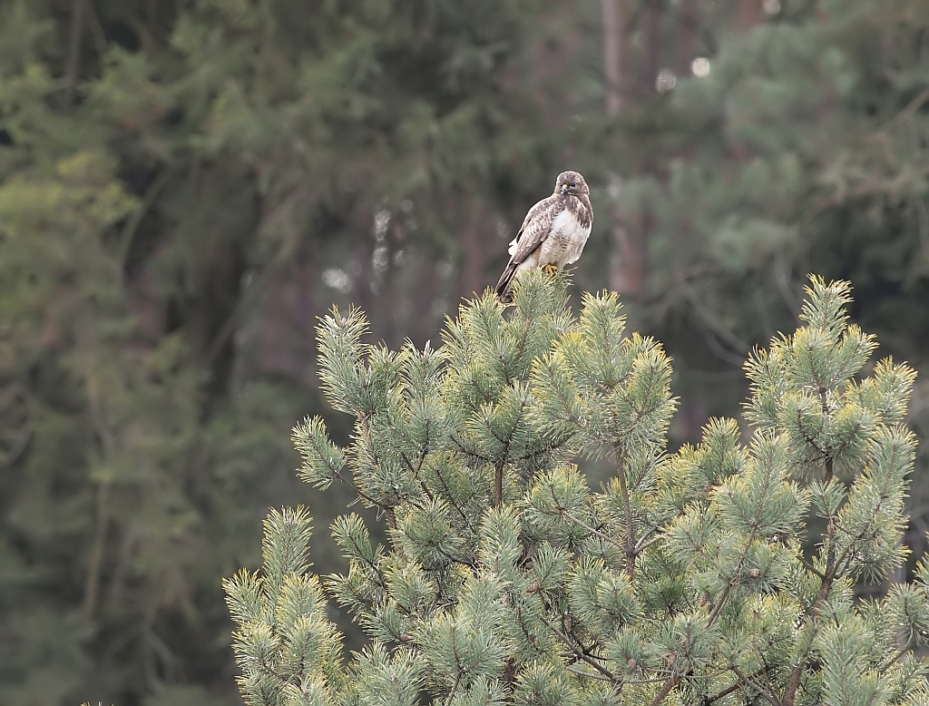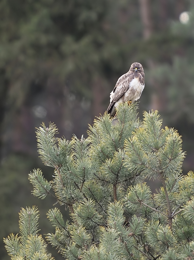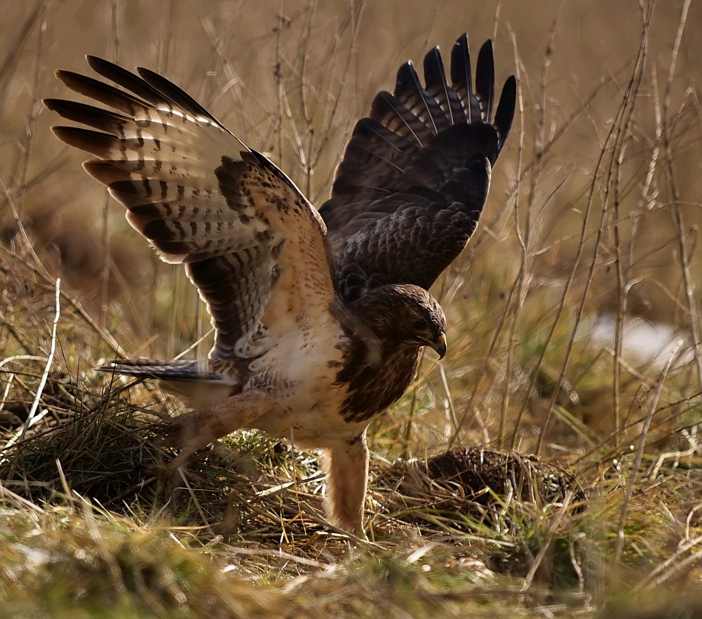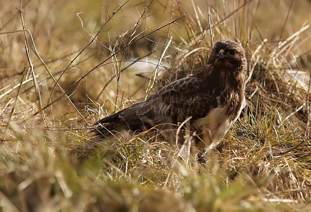 Jednak od końcówki stycznia jakoś się wyludniło, zapewne to o czym pisałem, ktoś tam polował i wypłoszył mi ptaszory, zdewastował też czatę. Odbudowałem i dalej nęciłem, porcje znikały ale już nie tak szybko jak wcześniej, parę razy siadałem bez rezultatów, straciłem już nadzieję. Pod koniec testowania przyfarciło mi się nieco, przyleciał dosłownie na parę minut jeden Myszak. Najperw usiadł na drzewie, nieufnie rozglądał się, po czym wylądował obok nęciska w gęstym zielu, tam jeszcze chwile pobaraszkował i niedługo potem czmychnął w siną dal i tyle go widziałem. Jako, że już wcześniej był w teście opisany to wstawiam tylko kilka zdjęć.