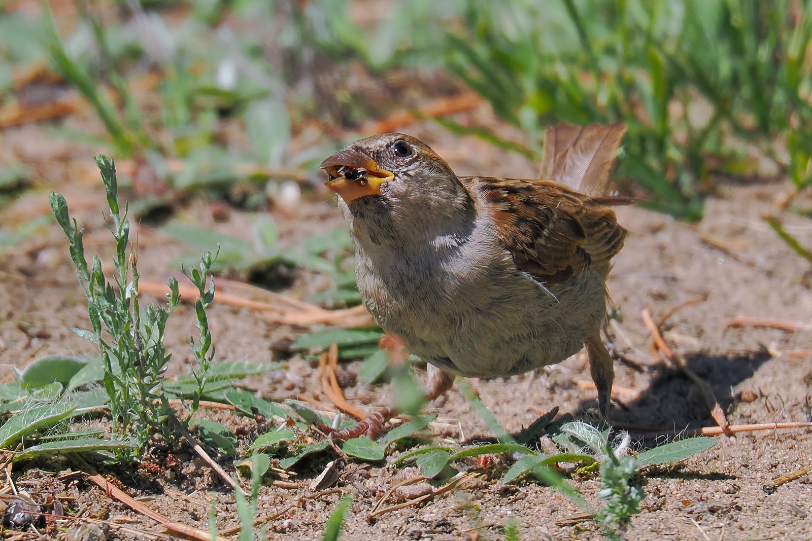 Wróbel ze zdobyczą w dziobie. Na pierwszym zdjęciu zdobycz nie jest jeszcze zmiażdżona i można rozpoznać że jest nią jakiś mały ryjkowiec - prawdopodobnie oprzędzik łubinowy: