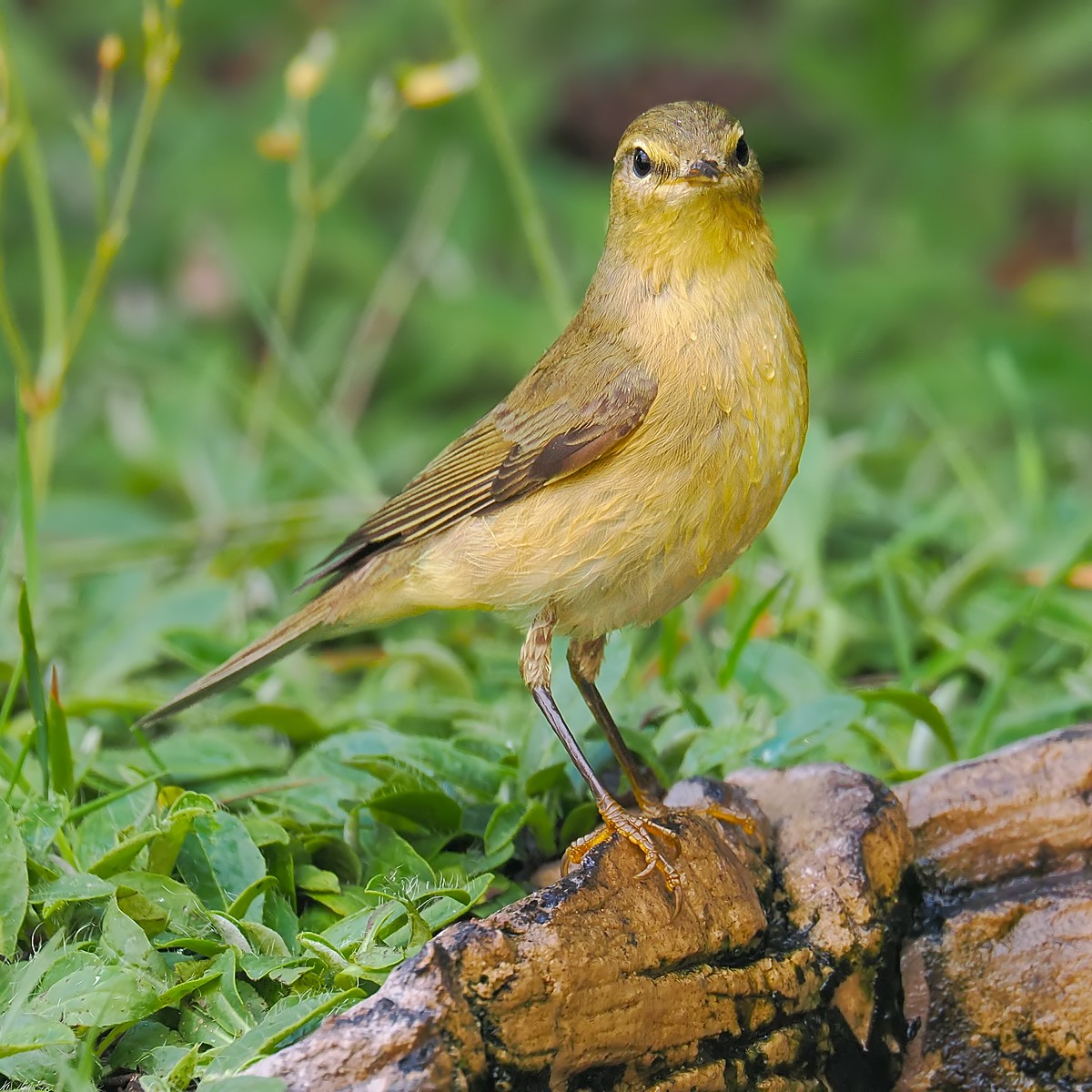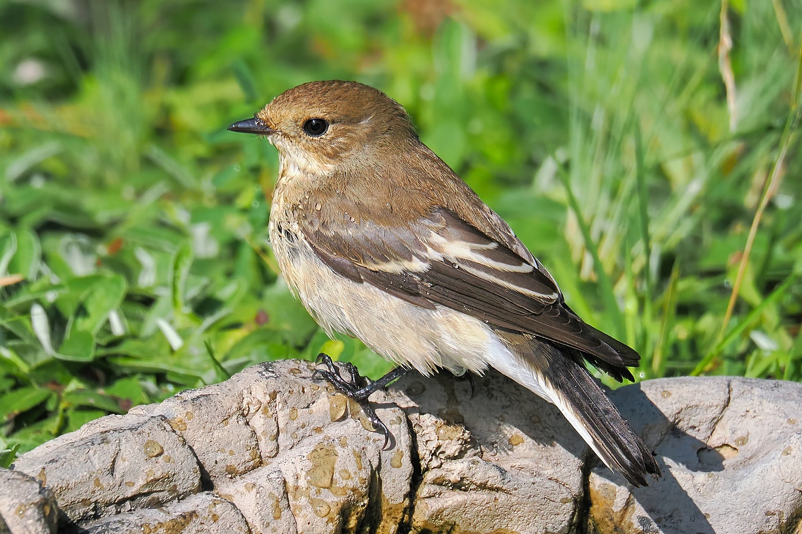 Muchołówka żałobna odpoczywająca po kąpieli na krawędzi baseniku: