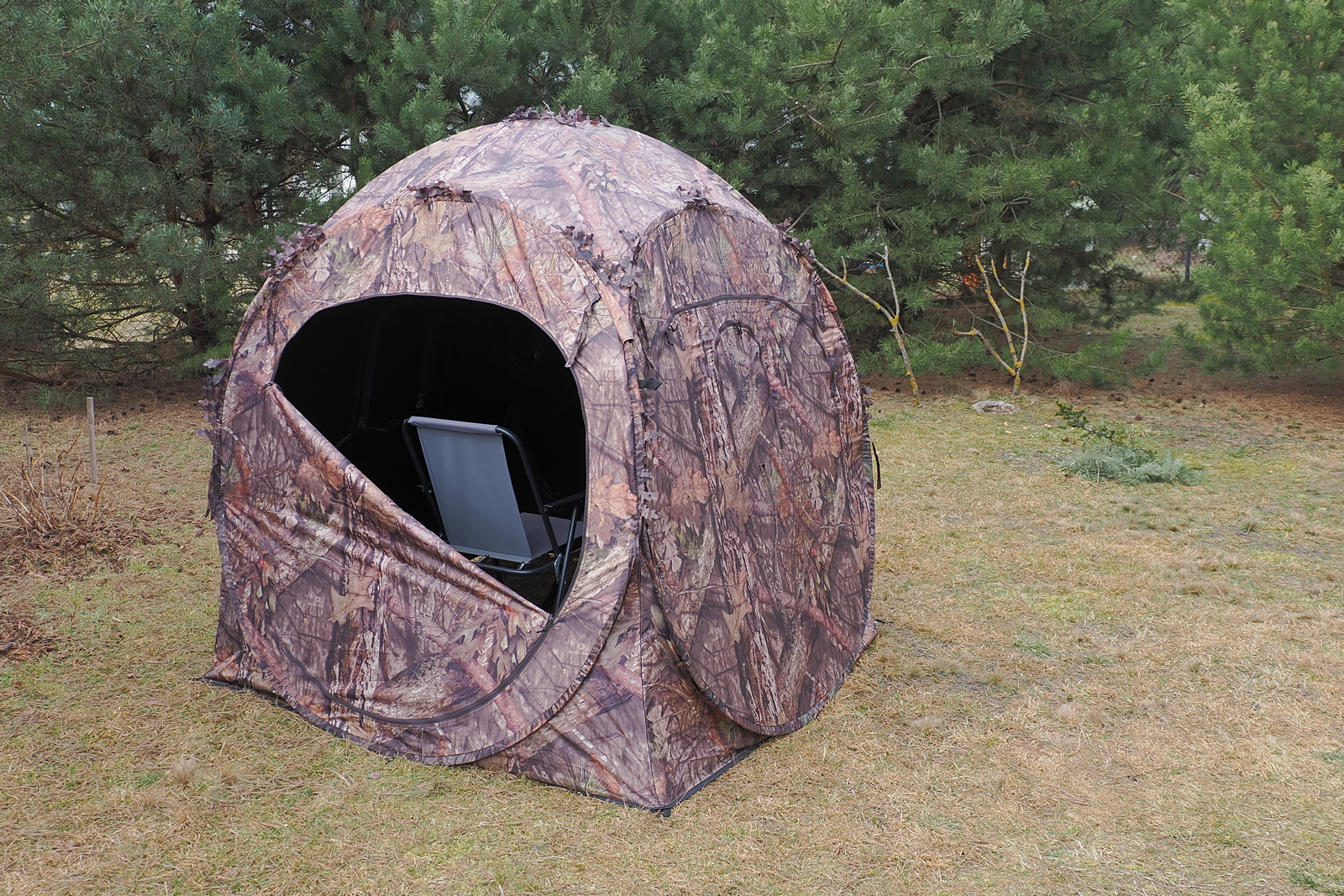 Zdjęcie wykonane z ukrycia w nabytym kilka miesięcy temu namiocie myśliwskim podczas jego pierwszych testów terenowych. Rozstawia się go i składa w ciągu kilkudziesięciu sekund, w środku jest sporo miejsca (można się zmieścić ze statywem i wygodnie za nim usiąść na rozstawianym krzesełku, widoczność zapewniają zamykane na zamek błyskawiczny okienka. Sprawdza się w/g mnie bardzo dobrze - ptaszki (przynajmniej te które o tej porze się pojawiały - sikory, dzwońce, trznadle, zięby) podlatują bez obaw na odległość kilku metrów. Sądzę że teraz większość zdjęć ptaków będę z niego wykonywał. I jeszcze zdjęcia samego namiotu ustawionego w miejscu z którego fotografowałem sikory: