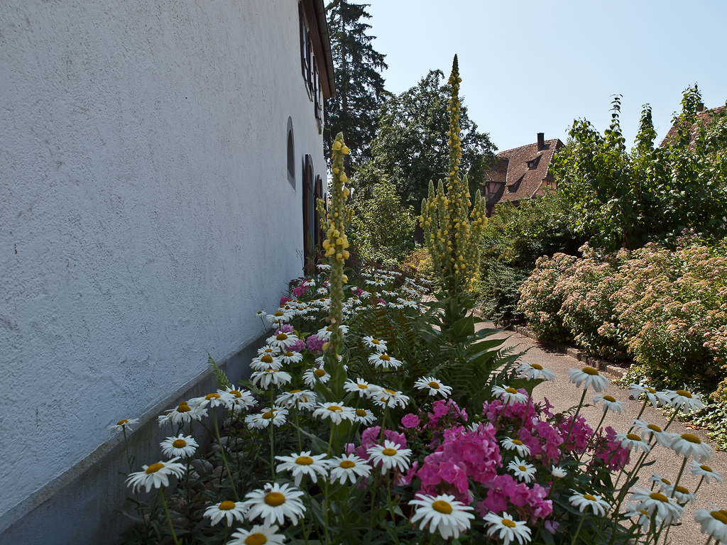 Nie wiem czy masz w PS taki filtr który do daje kontrast lokalny lub mikrokontrast. W Gimpie mam Local Contrast Enhancement. I tylko to nałożyłem na ścianę. Plus delikatne wyostrzenie kwiatków na pierwszym planie. Acha, i w niebie coś grzebnąłem :mrgreen: