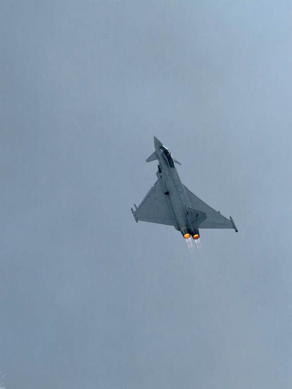 Włoski Eurofighter. Awaryjne(choć na to nie wygląda)lądowanie. Pilot zgłaszał problemy ze sterowaniem. Stałem obok kolegi z radiem stąd wiem. Wszyscy zamarli. Była obawa, że nie doleci. Ale chyba nic złego się nie stało, bo później jeszcze latał. Procedury zadziałały :-)