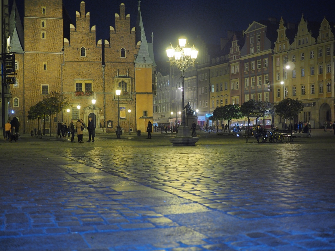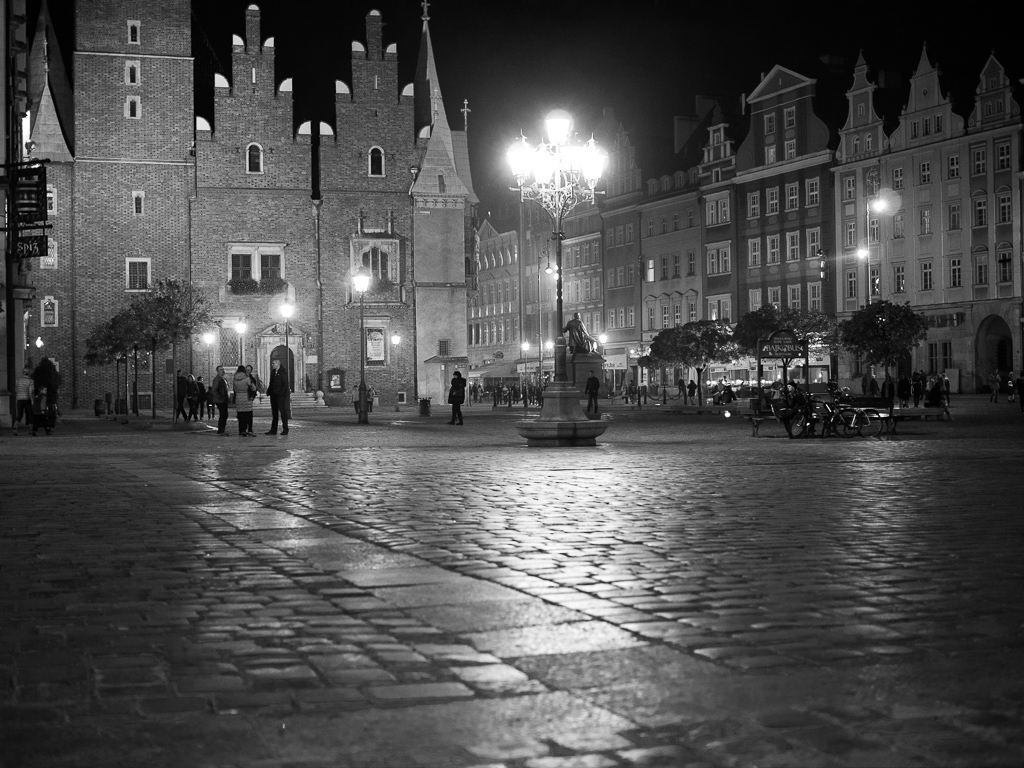 Już kilka razy się nad tym głowiłem - czy "prostować" światła w takim oświetleniu, czy zostawić tak, jak to zarejestrował aparat? Bo aparat nic źle nie zrobił, zarejestrował scenę dokładnie tak, jak ją widziałem. Bruk, elewacje budynków - na wszystko oddziałują światła latarni nadając barwę taką, jak na zdjęciu. Kolory są inne od tych w oświetleniu dziennym, ale przecież tak dokładnie ma być.