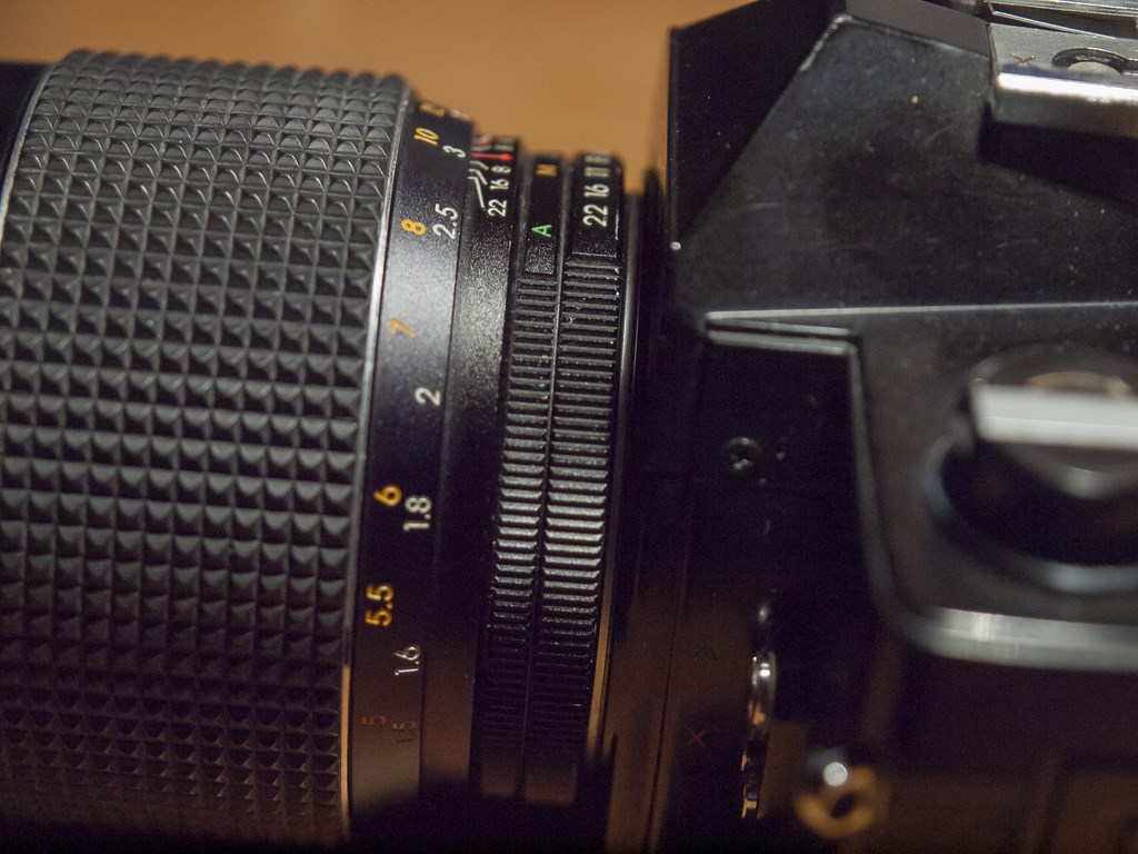Ma niestety wadę. Strasznie wąskie i blisko siebie pierścienie od przysłony i auto-manual. Do tego przy samym mocowaniu, niewygodne to to strasznie.