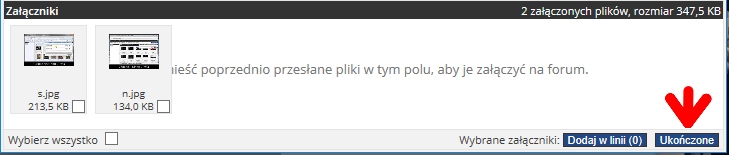 Po wybraniu załączników, na dole okna pojawią się one jako "zaptaszkowane" miniaturki a w prawym dolnym rogu (obok przycisku Zakończ), na przycisku "Dodaj w linii" w nawiasie jest ich liczba.