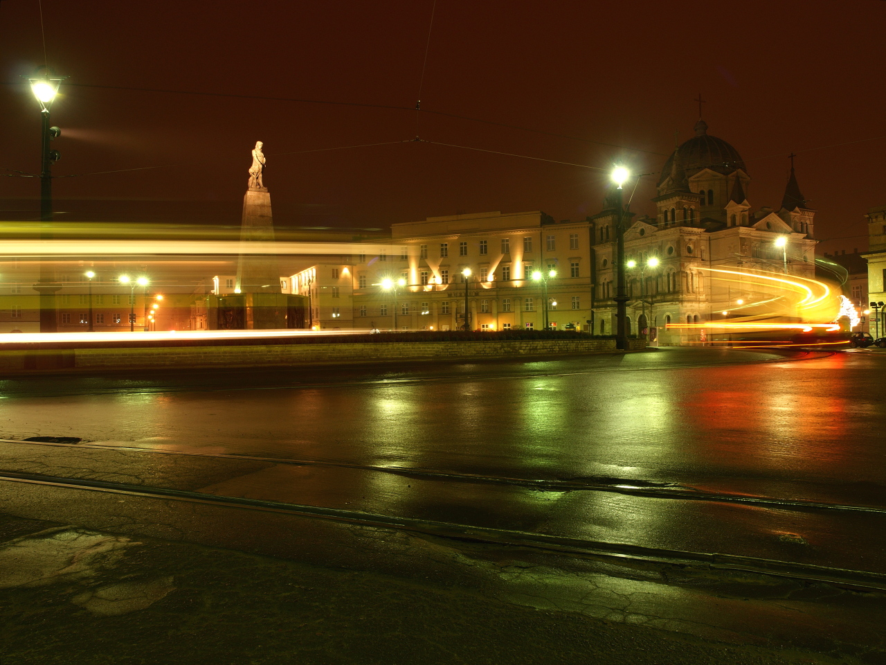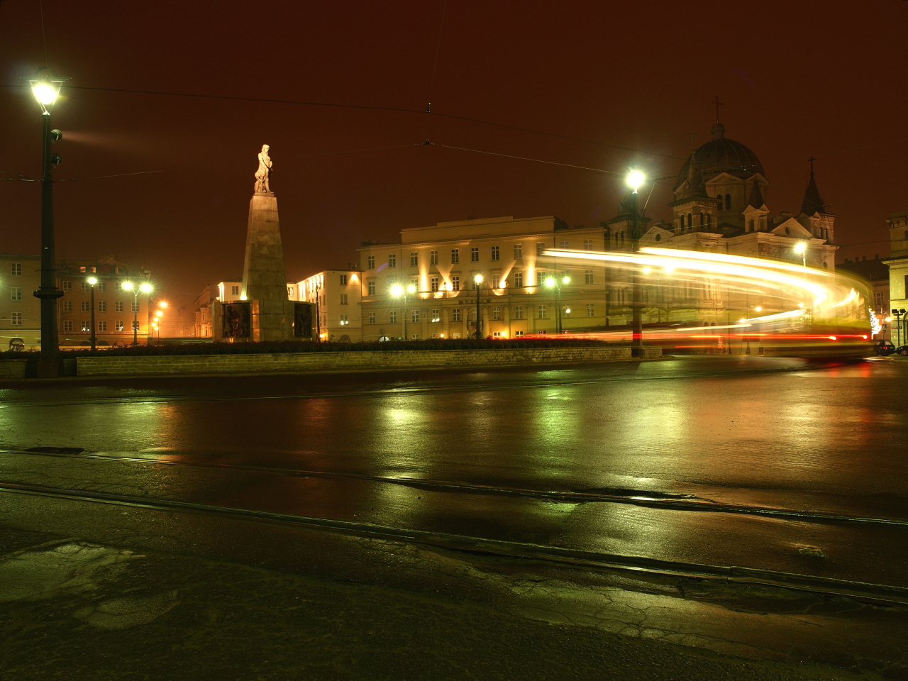 Pamiętacie zapewne moje foty z 2 listopada, gdy celowałem wieczorem na placu w dojeżdżające do przystanków autobusy. Tamta sesja zachęciła mnie do zmiany miejsca polowania. Wybrałem zatem takie w którym widać jak błysk świateł oświetla Kościuszkę na pomniku. Moim przygotowaniom towarzyszyło kilku zaciekawionych taksówkarzy, mogłem się więc czuć bezpiecznie i skupić tylko na fotkach, a w to mi graj.