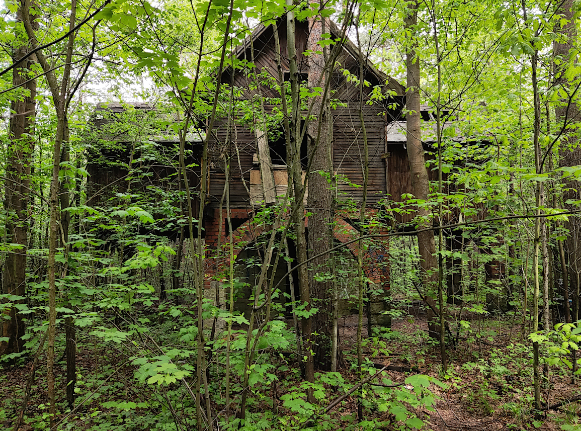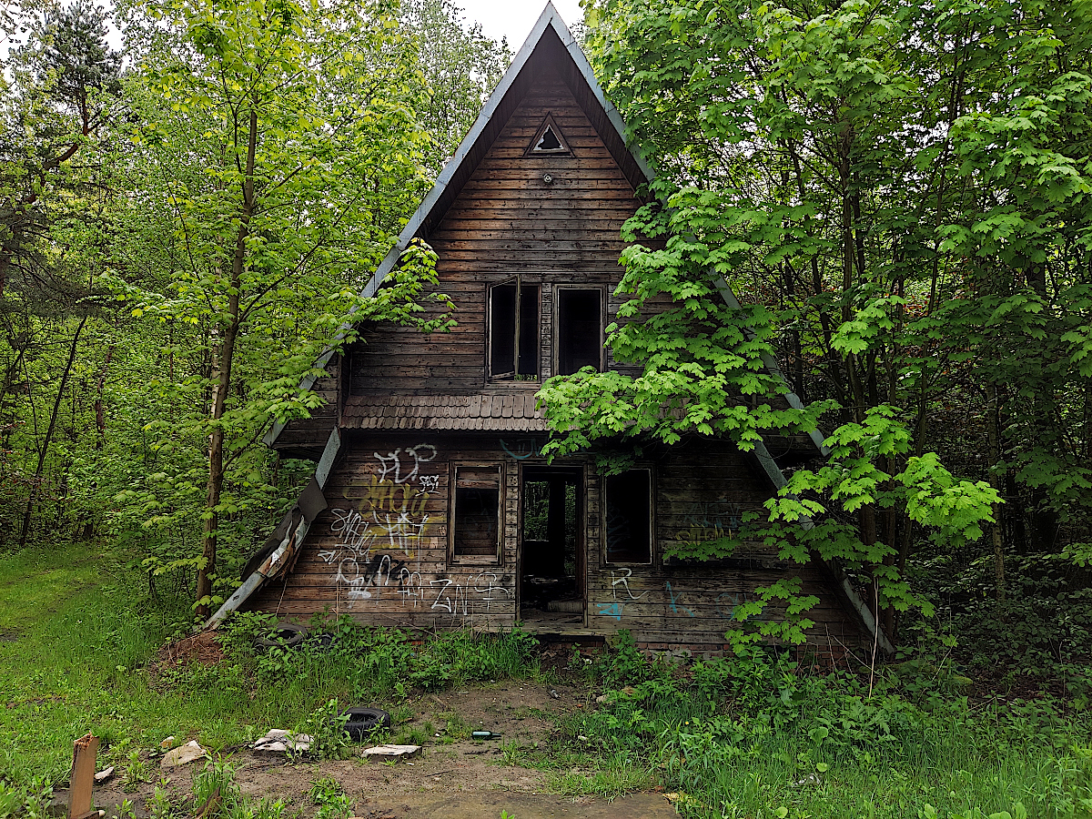 W lesie. Opuszczone, zrujnowane.